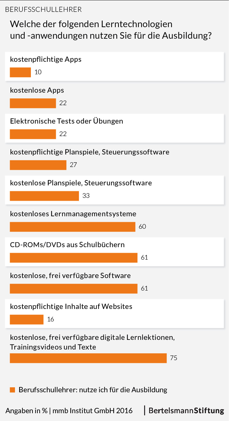 Dem "Monitor Digitale Bildung" zufolge setzen 97 Prozent der Berufschullehrer das Internet zur Recherche im Unterricht ein. Nur 34 Prozent der Lehrer nutzen hingegen Lernmanagementsysteme, Selbstlernprogramme oder digitale Medien zur Entwicklung eigenständiger Inhalte. Da verwundert es kaum, dass nur 33 Prozent der Berufsschullehrer digitale Lerntechnologien als Möglichkeit sehen, zu besseren Lernergebnissen zu kommen. In Ausbildungsbetrieben ist die Lage ähnlich: Hier spielen Selbstlernprogramme (32 Prozent) oder webbasierte Trainings (18 Prozent) nur eine geringe Rolle.