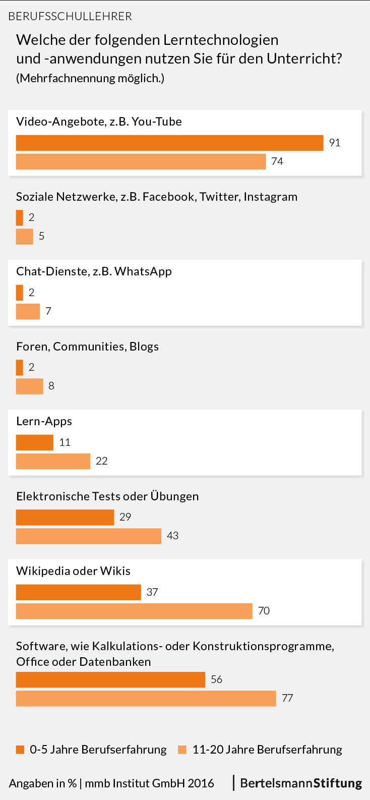 Unter den Befürwortern finden sich vor allem erfahrene Berufsschullehrer. Immerhin 77 Prozent derjenigen mit mehr als zehn Jahren Berufserfahrung nutzen Software im Unterricht, gefolgt von Wikis (70 Prozent) und elektronischen Tests (43 Prozent). Kollegen mit weniger Erfahrung bleiben dahinter zurück, obwohl sie zu den Digital Natives gezählt werden. Nur 56 Prozent von ihnen nutzen Software, 37 Prozent Wikis und 29 Prozent elektronische Tests. Grund dafür: Berufseinsteigern fehlt die Zeit, sich mit digitalem Lernen zu befassen.