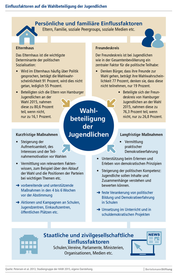 Je früher und je häufiger Erst- und Jungwähler ihre Stimme abgeben, desto höher fällt langfristig auch die allgemeine Wahlbeteiligung aus. Durch das Wahlrecht ab 16 kann es gelingen, die Wahlbeteiligung von 71,5 Prozent (Bundestagswahl 2013) auf bis zu 80 Prozent (2049) zu steigern. Das geht aus der Studie "Wählen ab 16" der Bertelsmann Stiftung hervor. Sie prognostiziert in drei Szenarien die zukünftige Höhe der Wahlbeteiligung auf Bundesebene – mit und ohne 16-jährige Erstwähler.