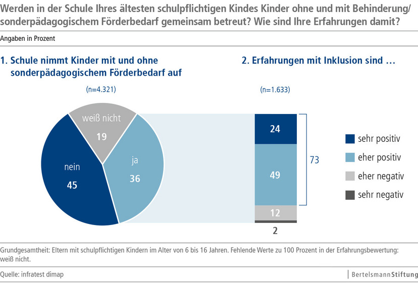 Mehr als ein Drittel der rund 4300 befragten Eltern gab an, ihr Kind besuche eine inklusive Schule. Von diesen Eltern sind 68 Prozent mit der individuellen Förderung ihrer Kinder zufrieden. Eltern hingegen, deren Kinder eine nicht-inklusive Schule besuchen, sagen dies nur zu 58 Prozent. Zwei Drittel der Befragten schätzen an der inklusiven Schule, dass ihre Kinder dort im eigenen Tempo lernen können. Das sagen nur 58 Prozent der Eltern über die nicht-inklusive Schule ihrer Kinder. Auch den sozialen Zusammenhalt an inklusiven Schulen schätzen Eltern höher ein als an nicht-inklusiven Schulen (78 zu 73 Prozent).