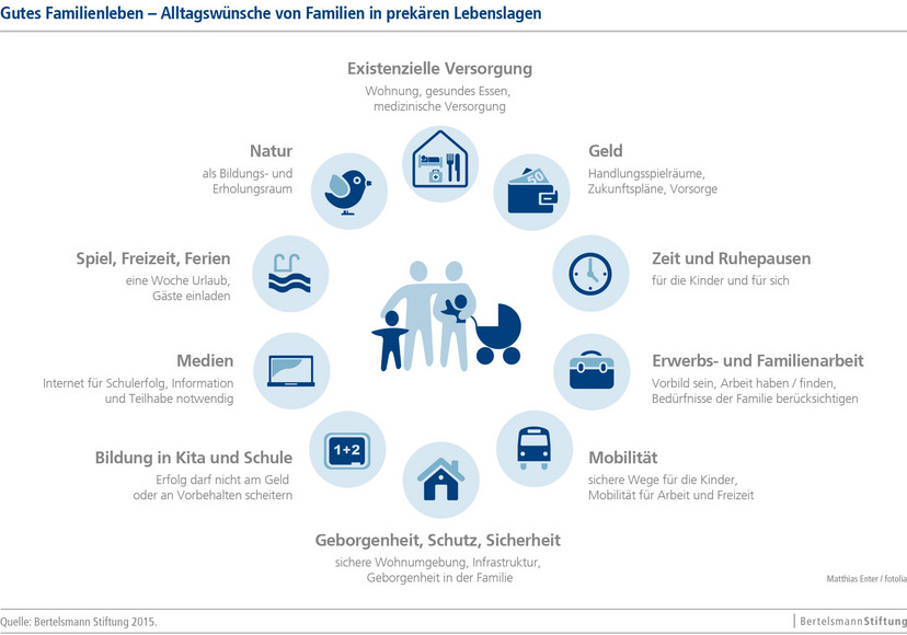 Bislang, so die Andresen/Galic-Studie, konzentriere sich die Familien- und Sozialpolitik zu stark auf die Integration von Eltern in den Arbeitsmarkt. Empfehlenswert sei die Einrichtung zentraler Anlaufstellen mit festen Ansprechpartnern, die die jeweilige Familiensituation kennen. Zugleich sollten strukturelle Veränderungen Fachkräften mehr Entscheidungsspielräume und eine passgenaue Unterstützung ermöglichen. Zudem setzt sich die Bertelsmann Stiftung dafür ein, das Existenzminimum für Kinder zu überprüfen und die staatliche Grundsicherung anzupassen.