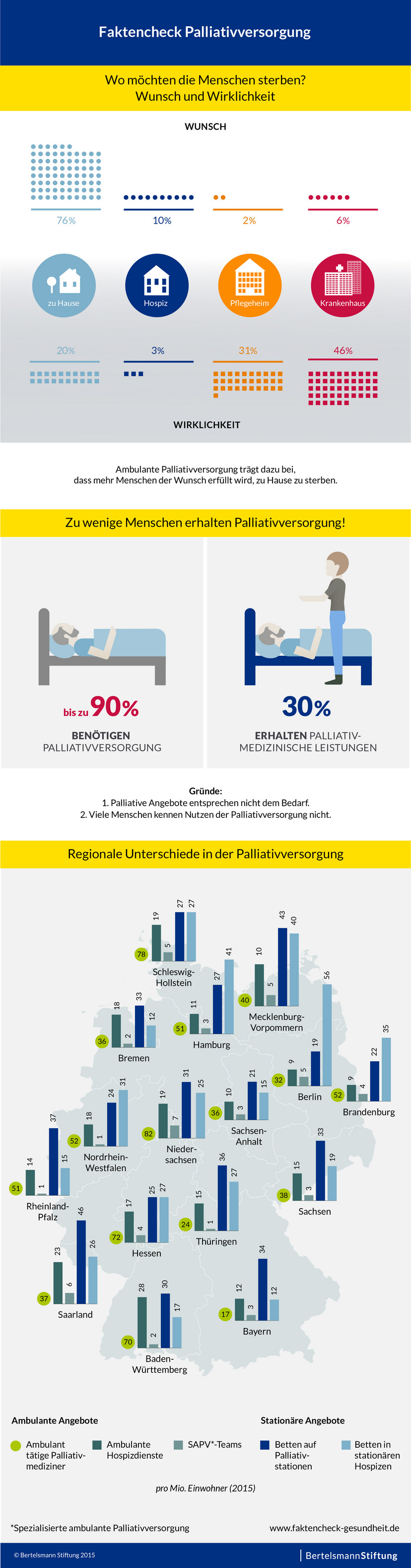 Nur sechs Prozent der Deutschen möchten ihre letzte Lebensphase im Krankenhaus verbringen. Für ein würdevolles Sterben zu Hause müsste jedoch die ambulante palliative Versorgung weiter ausgebaut werden. Denn noch stirbt fast jeder zweite ältere Mensch in Deutschland in einer Klinik. Das geht aus dem aktuellen Faktencheck Gesundheit der Bertelsmann Stiftung hervor, der die Versorgungsleistungen für Menschen während der letzten Lebensphase untersucht hat.