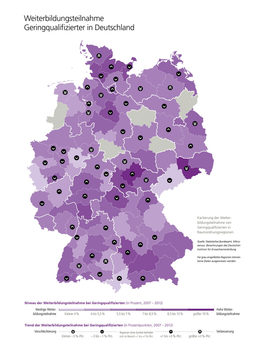 In einzelnen Raumordnungsregionen ist die Weiterbildungsbeteiligung dreimal so hoch wie in anderen. Die Höchstwerte finden sich nach Würzburg in Ingolstadt und Augsburg mit um die 18 Prozent. Die niedrigsten Quoten verzeichnen neben dem Emsland Aachen und Ostfriesland mit 6,5 bis 7,6 Prozent. Die Quoten der Bundesländer unterscheiden sich weniger stark: Spitzenreiter ist Hessen mit 16 Prozent, gefolgt von Baden-Württemberg und Bayern (15,7 beziehungsweise 14,8 Prozent). Die geringsten Quoten finden sich im Saarland, in Sachsen-Anhalt und in Sachsen (11,3, 11,6 und 11,9 Prozent).