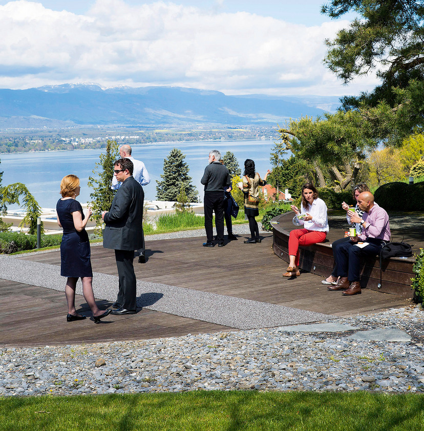 Gut 600 Mitarbeiter hat das Forum, die meisten davon in diesem Think-Tank am See. Wer verstehen will, was hier passiert, tut am besten das, was auch Gründer Klaus Schwab gerne macht: Er macht sich auf den langen Weg durch die hellen Flure und Großraumbüros, die offenen Konferenzflächen und Kantinenbereiche, in denen es brummt wie in einem Bienenstock. Ein sehr junger, sehr weiblicher, sehr internationaler Bienenstock: Der Frauenanteil liegt je nach Organisationsebene bei 40 bis 60 Prozent, Tendenz steigend, und jeder Kantinentisch sieht aus wie eine kleine UN-Vollversammlung, bei der sich die alten Würdenträger durch ihre besten Nachwuchskräfte vertreten lassen.