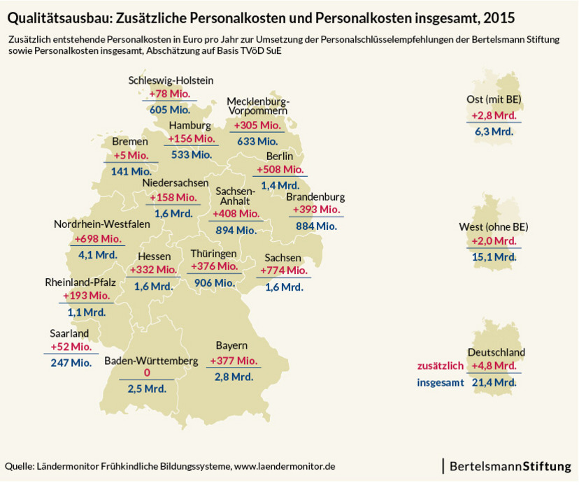 Um die Personalschlüssel auf das von der Bertelsmann Stiftung empfohlene Niveau zu heben, sind bundesweit zusätzlich 107.000 vollzeitbeschäftigte Fachkräfte erforderlich. Dieses Personal kostet nach Berechnungen der Stiftung jährlich rund 4,8 Milliarden Euro. Verglichen mit den derzeit im Kita-Bereich anfallenden Personalkosten in Höhe von 16,6 Milliarden wäre das ein Anstieg von rund einem Drittel (29 Prozent).