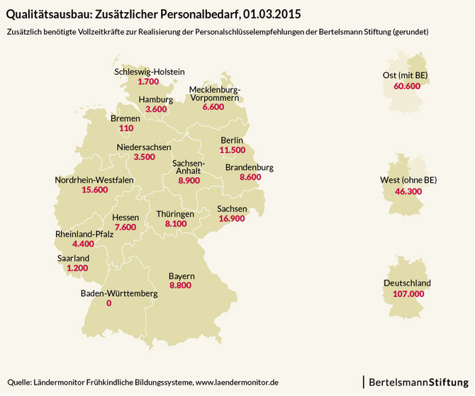 Um die Personalschlüssel auf das von der Bertelsmann Stiftung empfohlene Niveau zu heben, sind bundesweit zusätzlich 107.000 vollzeitbeschäftigte Fachkräfte erforderlich. Dieses Personal kostet nach Berechnungen der Stiftung jährlich rund 4,8 Milliarden Euro. Verglichen mit den derzeit im Kita-Bereich anfallenden Personalkosten in Höhe von 16,6 Milliarden wäre das ein Anstieg von rund einem Drittel (29 Prozent).