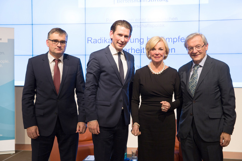 Kurz war der Einladung von Liz Mohn, stellvertretende Vorstandsvorsitzende der Bertelsmann Stiftung, gefolgt. Auf der Veranstaltung mit dem Thema: "Radikalisierung bekämpfen – Sicherheit wahren" stellte er sich den Fragen von Stefan Kornelius, Leiter des außenpolitischen Ressorts der Süddeutschen Zeitung.