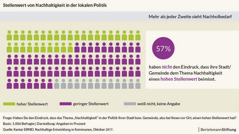 Jeder zweite Deutsche (57 Prozent) hat nicht das Gefühl, dass sich die Politik der eigenen Stadt oder Gemeinde besonders für eine nachhaltige Entwicklung engagiert. Dabei stufen 81 Prozent der Bürger das Thema Nachhaltigkeit als persönlich wichtig ein und immerhin zwei Drittel signalisieren eine große Bereitschaft, sich für mehr Nachhaltigkeit einzusetzen. Dies ergab eine repräsentative Befragung von Kantar Emnid, die wir im Rahmen des "Monitors Nachhaltige Kommune" in Auftrag gegeben haben.