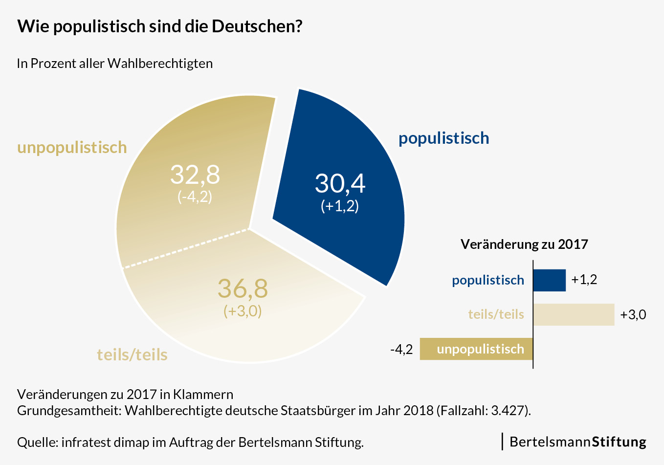 Die Wählerschaft in Deutschland ist zunehmend populistisch eingestellt. Knapp jeder dritte Wahlberechtigte (30,4 Prozent) in Deutschland unterstützt laut dem neuen Populismusbarometer alle abgefragten populistischen Positionen. Das ist etwas mehr als im Vorjahr (29,2 Prozent). Gleichzeitig ist die Gruppe der eindeutig unpopulistischen Wähler auf 32,8 Prozent gesunken (2017: 36,9 Prozent). Dabei gilt: Je höher der Bildungsgrad und das Einkommen, desto weniger verbreitet sind populistische Einstellungen. Die größten Verschiebungen verzeichnet die Studie in der politischen Mitte: Hier nehmen die populistischen Einstellungen am stärksten zu und die unpopulistischen Einstellungen am stärksten ab.