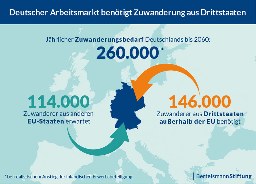 Deutschland hat bis 2060 einen jährlichen Einwanderungsbedarf von mindestens 260.000 Menschen. Nur so lässt sich der demographisch bedingte Rückgang des Arbeitskräfteangebots auf ein für die Wirtschaft verträgliches Maß begrenzen. Es ist zu erwarten, dass im Jahresdurchschnitt rund 114.000 Zuwanderer aus anderen EU-Staaten kommen werden, demnach rund 146.000 Personen aber aus Drittstaaten außerhalb der EU einwandern müssten. Zu diesen Ergebnissen kommt eine Untersuchung von Johann Fuchs und Alexander Kubis vom Institut für Arbeitsmarkt und Berufsforschung (IAB) sowie Lutz Schneider von der Hochschule Coburg in unserem Auftrag.