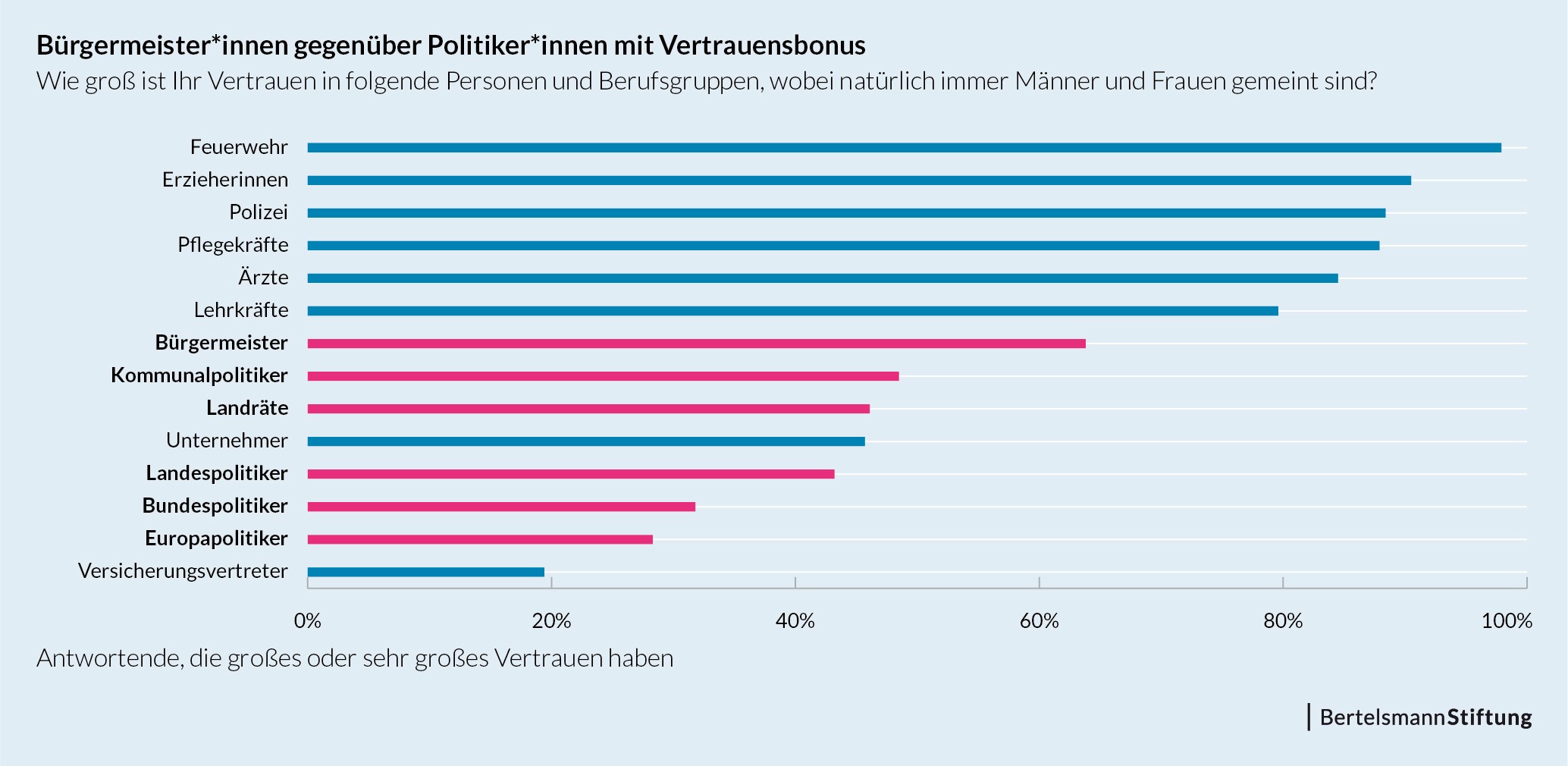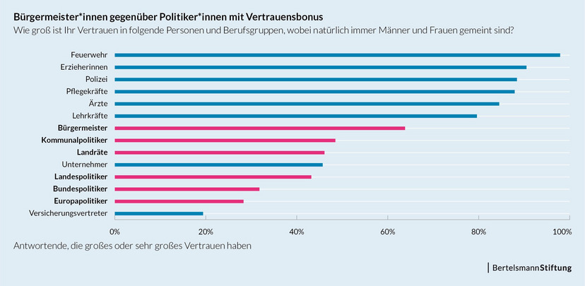 Bürgermeistern und Kommunalpolitikern wird außerdem vergleichsweise großes Vertrauen entgegengebracht: Während nur 28,3 Prozent der Befragten Bundespolitikern und 31,8 Prozent Europapolitikern großes oder sehr großes Vertrauen entgegenbringen, geben immerhin 48,5 Prozent an, Kommunalpolitikern großes oder sehr großes Vertrauen entgegenzubringen. Bei Bürgermeistern liegt die Quote gar bei 63,8 Prozent.