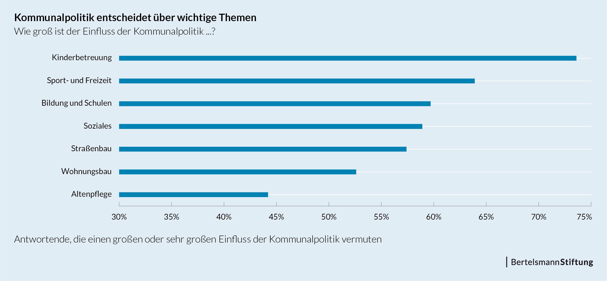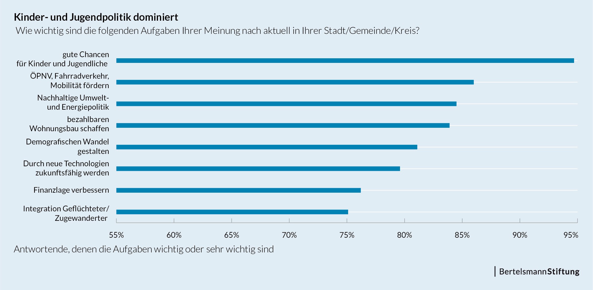 94,7 Prozent der Bürger halten es für eine "wichtige oder sehr wichtige" Aufgabe der Kommunalpolitik, Kindern und Jugendlichen gute Chancen zu ermöglichen. Diese Einschätzung ist unabhängig vom Alter, vom Bundesland und von der Größe der Kommune, in der die Befragten leben. Das Thema steht neben Mobilität (86 Prozent), Umwelt (84,5 Prozent) und Wohnen (83,9 Prozent) ganz oben auf der Themenskala. Die Bürger sind sich darüber im Klaren, dass Kommunalpolitik eine entscheidende Rolle spielt: Insbesondere bei Kinderbetreuung (73,6 Prozent), Sport- und Freizeitangeboten (63,9 Prozent) sowie Bildung und Schulen (59,7 Prozent) wird Kommunen laut repräsentativer Umfrage in unserem Auftrag ein hoher Problemlösungsbeitrag attestiert.