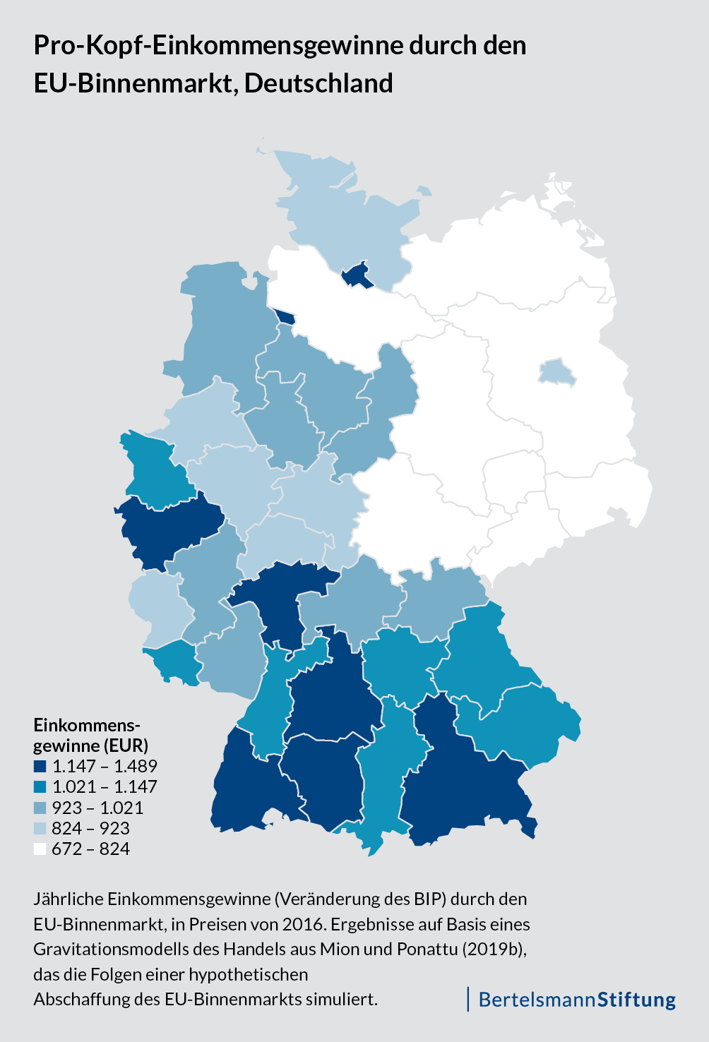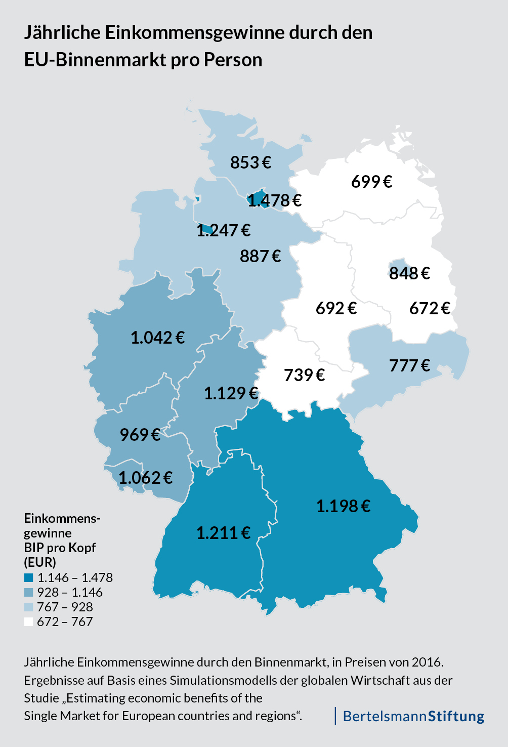Der EU-Binnenmarkt hat nicht nur den Abbau von Grenzkontrollen bewirkt, sondern beschert den Europäern grundsätzlich auch ein Plus im Portemonnaie. Im Durchschnitt steigert der Binnenmarkt die Einkommen der EU-Bürger jährlich um rund 840 Euro pro Person. Für Deutschland beziffern sich die jährlichen Einkommenszuwächse pro Person auf 1.046 Euro.