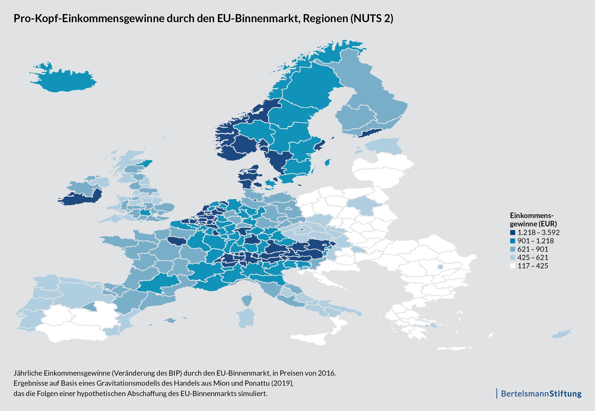 Zürich und London zählen zu den Regionen, in denen die Einwohner mit über 2.000 Euro Einkommensgewinnen europaweit am stärksten profitieren. Damit sind einige der größten Gewinner des Binnenmarktes aktuell in Ländern zu Hause, die momentan kein EU-Mitglied sind oder zukünftig die Gemeinschaft und damit auch den Binnenmarkt verlassen könnten. Das sind die Ergebnisse einer umfassenden Analyse, für die unsere Autoren über 250 Regionen in Europa bezüglich der Einkommensgewinne durch den Binnenmarkt untersucht haben. Konkret haben sie das reale Bruttoinlandsprodukt pro Kopf und Jahr gemessen.