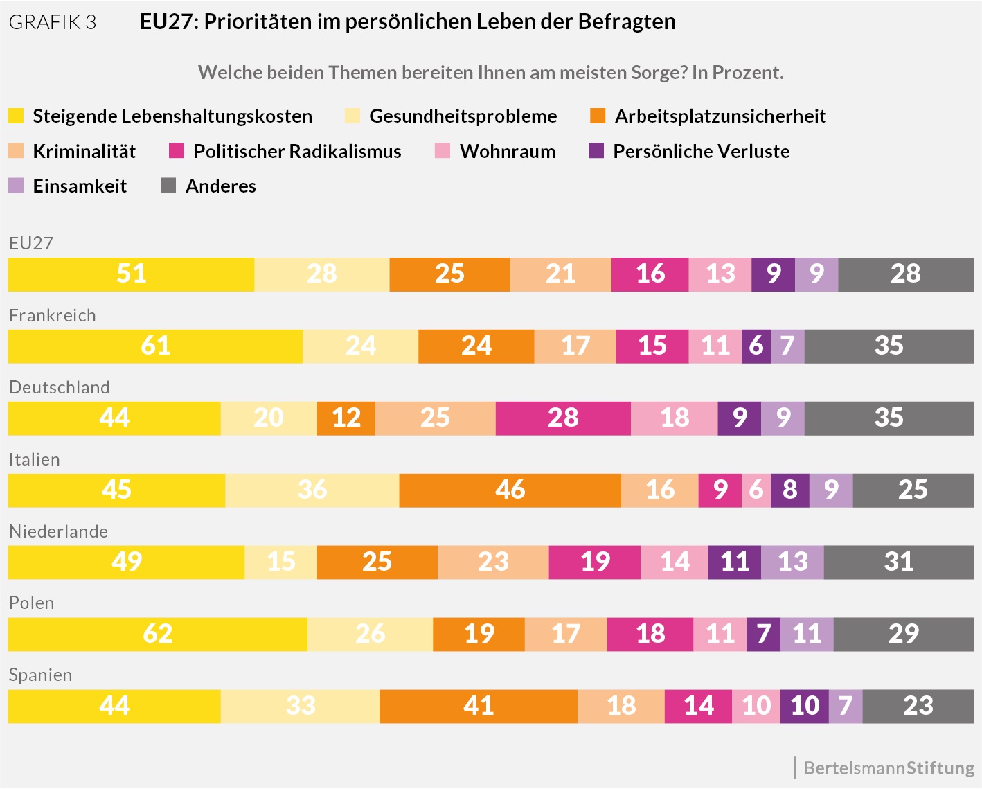 Auf der persönlichen Sorgenliste der Europäer stehen "steigende Lebenshaltungskosten" (51 Prozent) an erster Stelle. In Polen (62 Prozent) und Frankreich (61 Prozent) sind diese Ängste laut Umfrage am stärksten ausgeprägt, in Deutschland, der größten Wirtschaftsmacht Europas, hingegen am schwächsten (44 Prozent). In Italien ist dagegen die Furcht vor einem Arbeitsplatzverlust (46 Prozent) der größte Sorgentreiber.