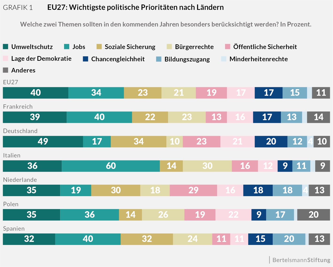 Mit 40 Prozent ist der Umweltschutz das mit Abstand wichtigste Thema für die Europäer, gefolgt von "Arbeitsplätzen" (34 Prozent) und "Sozialer Sicherheit" (23 Prozent). Zwischen den größten EU-Staaten gibt es jedoch einige Unterschiede auf ihren Prioritätenlisten: So ist der Umweltschutz jeweils in Deutschland (49 Prozent), Frankreich (39 Prozent) und den Niederlanden (35 Prozent) das wichtigste Thema. Vielen Italienern hingegen ist die Sicherheit ihrer Arbeitsplätze wichtiger (60 Prozent). Auch in Spanien (40 Prozent) ist den Menschen der Schutz ihrer Arbeitsplätze deutlich wichtiger als Umweltschutz.