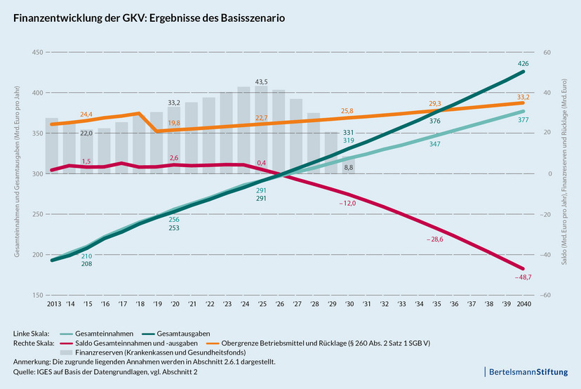 Bis 2040 erhöht sich das Defizit in der Gesetzlichen Krankenversicherung (GKV) auf fast 50 Milliarden Euro. Das ist das Ergebnis der Studie "Zukünftige Entwicklung der GKV-Finanzierung" des IGES Institutesin unserem Auftrag. Laut der Prognose geht nach Jahren mit Rekordüberschüssen in der Gesetzlichen Krankenversicherung ab Mitte der Zwanzigerjahre die Schere zwischen Gesundheitsausgaben und Beitragseinnahmen wieder auseinander.