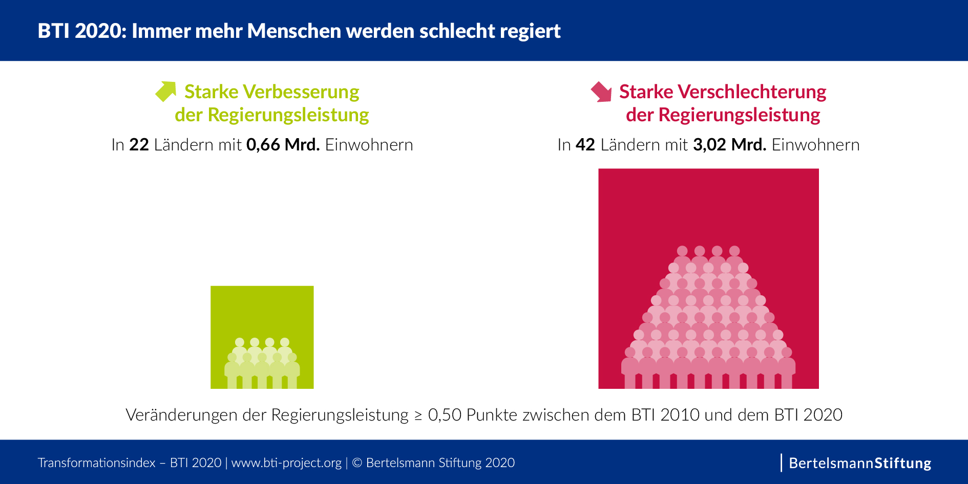 Diese chronischen Missstände sind häufig die Folgen von Machtkonzentration und Vetternwirtschaft. Eine kleine Elite betreibt diese auf Kosten des Großteils der Bevölkerung und untergräbt das Vertrauen in Demokratie und Marktwirtschaft. Der BTI 2020 verzeichnet in einer steigenden Zahl von mittlerweile über 100 Ländern einen verzerrten politischen und wirtschaftlichen Wettbewerb. Das gilt nicht nur für die 63 Autokratien, sondern auch für zahlreiche Demokratien mit schwacher Gewaltenteilung, wie Serbien und Ungarn, oder mit mangelhafter Wettbewerbspolitik, wie Indonesien und die Philippinen.