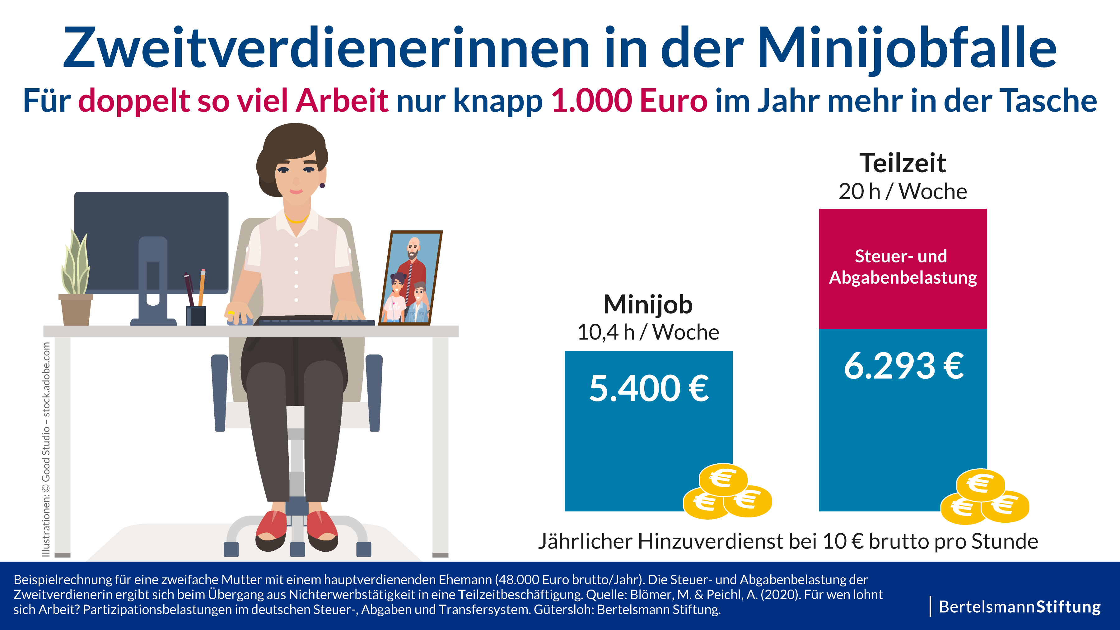 Für Frauen und Mütter ist der Minijob bis 450 Euro pro Monat zumeist die attraktivste Beschäftigungsform. Darüber hinaus gehende Arbeit in Teilzeit lohnt sich für sie vergleichsweise wenig. Für Alleinstehende und Alleinerziehende im Niedriglohn ist sogar nur die Aufnahme eines Kleinstjobs bis 100 Euro monatlich attraktiv.