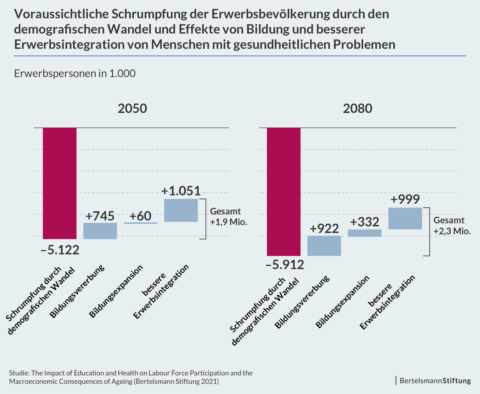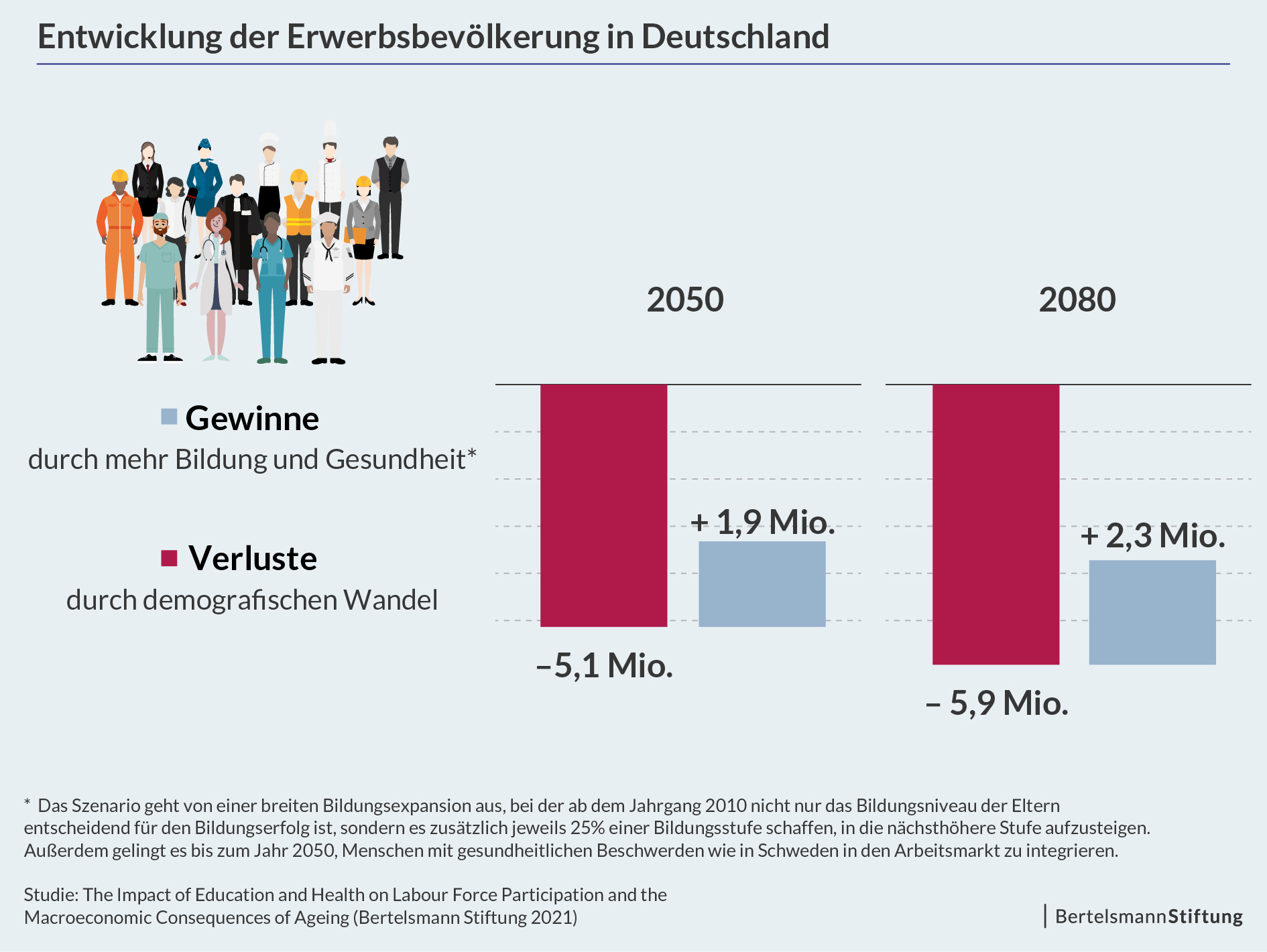 Der nur geringe Zuwachs an Erwerbspersonen bis 2050 erklärt sich dadurch, dass bei einer Bildungsexpansion junge Menschen länger in Ausbildung sind und in dieser Zeit dem Arbeitsmarkt nicht zur Verfügung stehen. Erst wenn sich die heute Jungen der Rente nähern, entfaltet die Bildungsexpansion ihre volle Wirkung. Die demografisch bedingte Schrumpfung bis zum Jahr 2080 (5,9 Millionen gegenüber 5,1 Millionen in 2050) würde so in der Summe dann um etwa 1,3 Millionen geringer ausfallen.