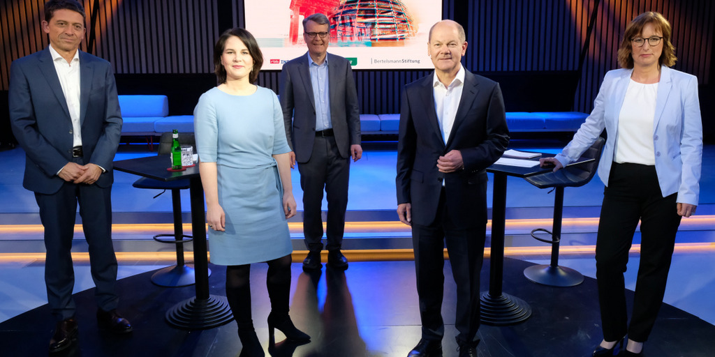 Auf die Anfeindungen ihrer Person gegenüber in den sozialen Medien angesprochen, sagte Baerbock zu Beginn der Debatte: "Was ich in den letzten Wochen über mich gehört und gelesen habe, tut uns als Gesellschaft nicht gut. Ich tue alles, um das zu ändern." Sie stehe stellvertretend für Menschen mit einem ähnlichen Lebenslauf, machte die Grünen-Chefin klar. Olaf Scholz unterstützte diesen Punkt: "Ich finde die Vorwürfe gegen Annalena Baerbock unmöglich. Das gehört sich nicht. Es hat auch in meiner politischen Laufbahn heftigste Angriffe gegeben. Es war für mich immer so, dass ich mir sicher bin, wer ich bin. Ich bin Politiker aus Überzeugung. Es geht um unser Land und ich möchte etwas tun für unsere Bürger."
