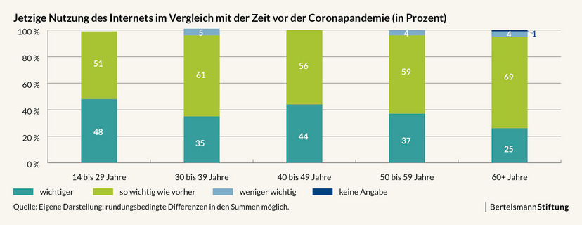 Knapp die Hälfte der 14- bis 29-Jährigen gibt an, dass die Internetnutzung für sie, verglichen mit der Zeit vor der Coronapandemie, wichtiger geworden ist. Die Erklärung: Diese Altersgruppe ist für ihre Bildung meist besonders auf das Internet angewiesen. "Bildung fand in den vergangenen Monaten oft digital statt. Die Umstellung auf Fernunterricht erhöht somit die Abhängigkeit vom Internet und von digitalen Kompetenzen für alle Beteiligten im Bildungsbetrieb maßgeblich. In der Folge verstärkt diese Abhängigkeit bestehende Bildungsunterschiede bei den Schüler:innen, aber auch die unterschiedlich ausgeprägten Kompetenzen der Lehrer:innen", erklärt unser Vorstandsmitglied Brigitte Mohn.