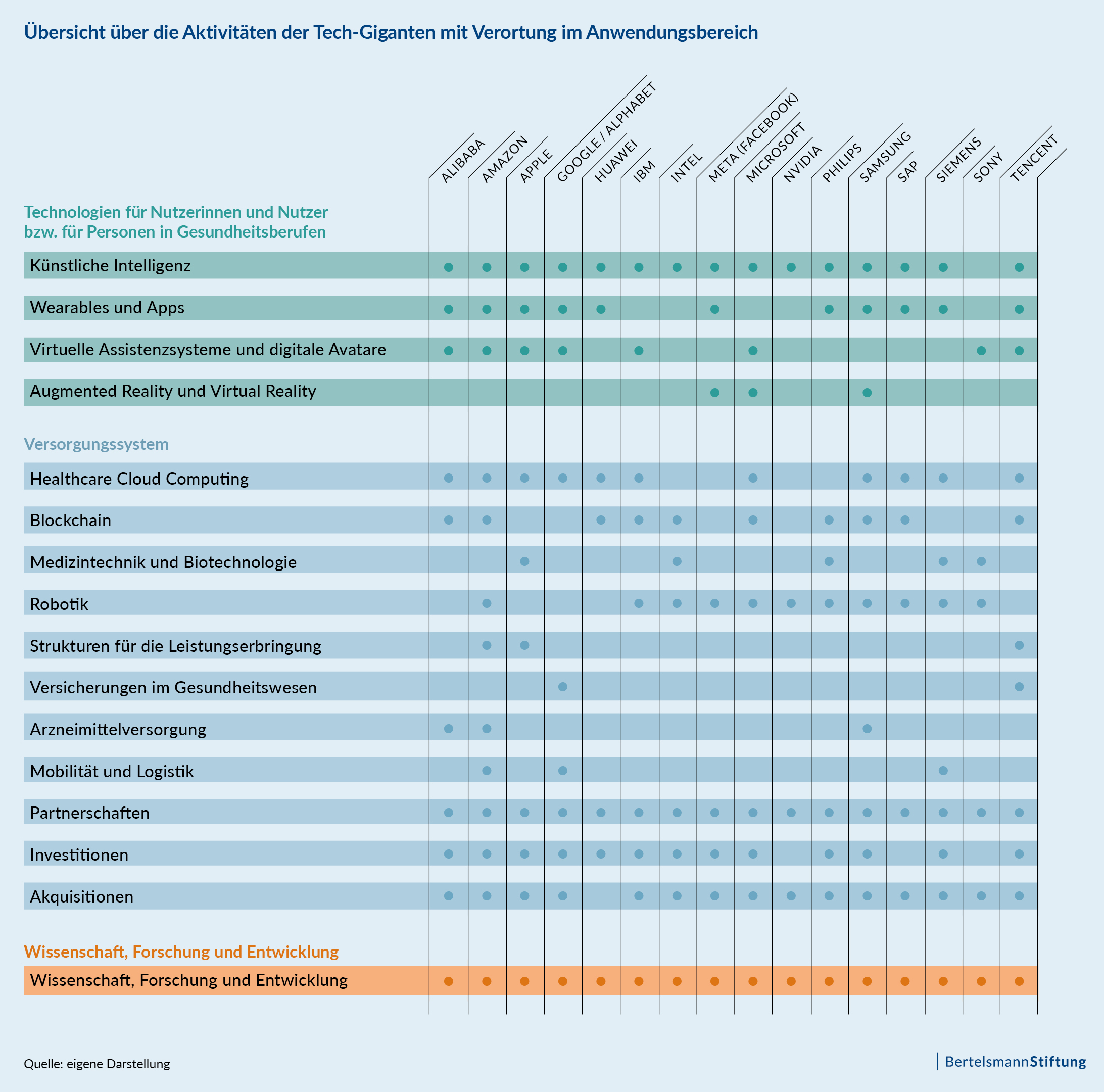 Ihre Aktivitäten und Geschäftsfelder weisen eine enorme Bandbreite auf. Neben Anwendungen für den individuellen Gebrauch, zum Beispiel Fitnessuhren oder Apps für Sport und Ernährung, spielen Angebote für Institutionen und Fachkräfte in der Gesundheitsbranche eine immer wichtigere Rolle. Dazu zählen etwa Softwarelösungen für die Diagnostik oder Plattformen für die teaminterne Vernetzung. Weit verbreitet sind Cloud-Lösungen zum Speichern, Verwalten, Auswerten und Teilen von Daten. Einige Unternehmen treten sogar selbst als Erbringer von Gesundheitsleistungen auf. Sie betreiben Online-Apotheken, produzieren und vertreiben Arzneimittel, bieten vereinzelt Krankenversicherungen an oder eröffnen telemedizinische Kliniken. Allen betrachteten Konzernen ist gemein, dass sie in Forschung und Entwicklung mit Gesundheitsbezug investieren.