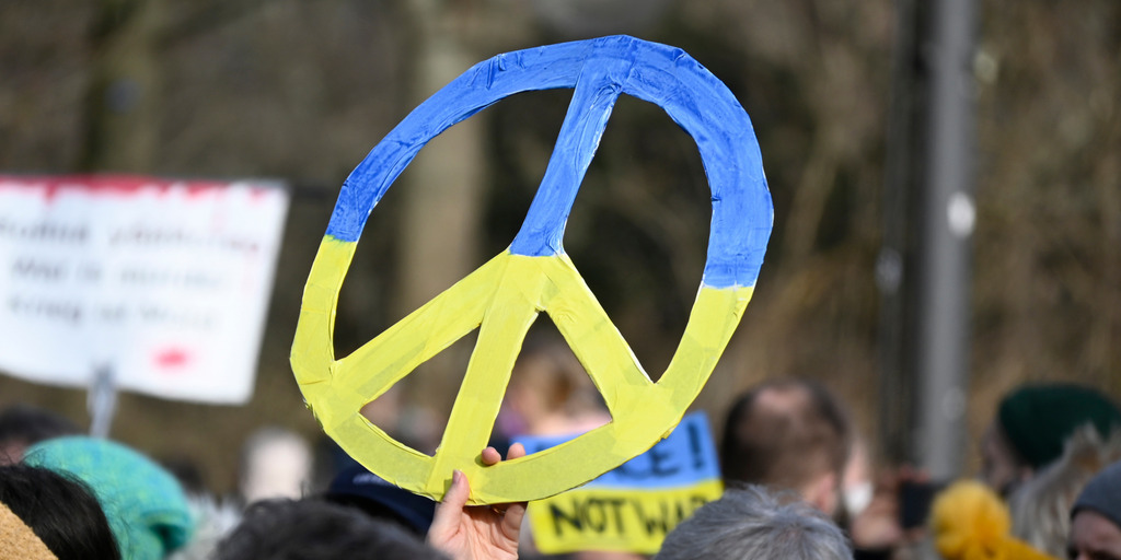 Bei einer Demonstration gegen den Krieg in der Ukraine am Brandenburger Tor in Berlin hält eine Person ein Friedens-Symbol in den Farben der ukrainischen Flagge, Blau und Gelb, in die Höhe.