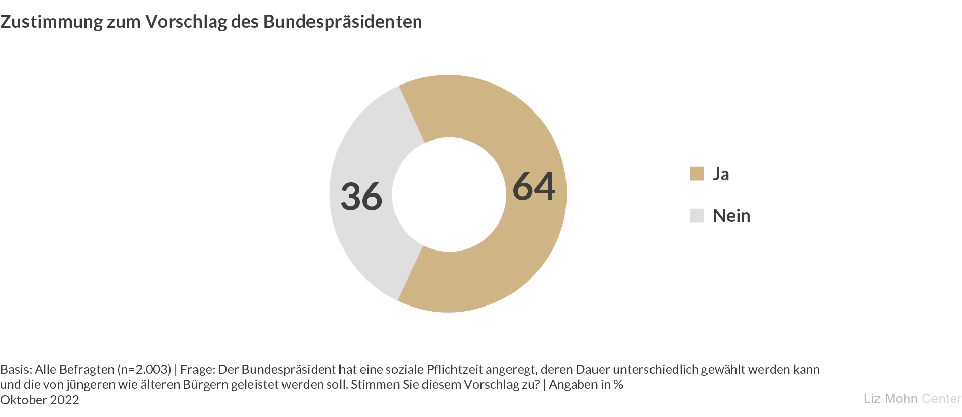 Rund zwei Drittel (64 Prozent) der Bevölkerung würden die Einführung einer flexibel gestaltbaren, altersunabhängigen Pflichtzeit für Männer und Frauen befürworten. Somit findet der Vorschlag des Bundespräsidenten einer Pflichtzeit für alle Bevölkerungsmitglieder eine breite Zustimmung in der Gesellschaft. Das ist das zentrale Ergebnis einer repräsentativen Umfrage des Meinungsforschungsinstituts IPSOS im Auftrag des Liz Mohn Centers der Bertelsmann Stiftung. Ein Drittel hingegen spricht sich gegen eine soziale Pflichtzeit aus, deren Dauer unterschiedlich gewählt werden kann und die von jüngeren wie älteren Bürger:innen geleistet werden sollte.