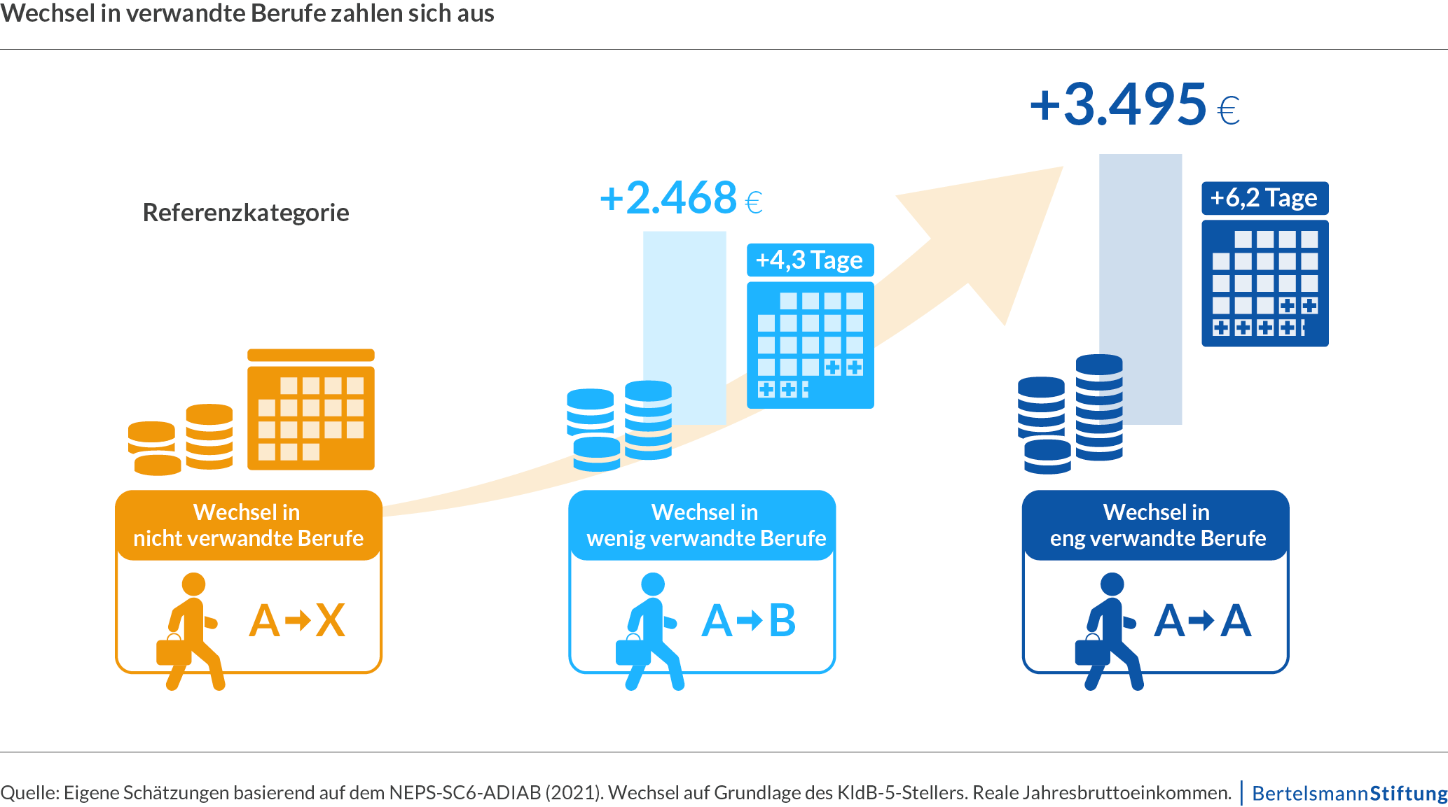 Ein erfolgreicher Wechsel erhöht zugleich auch die Produktivität. Wer in einem eng verwandten Job neu startet, ist im Schnitt 6,2 Tage pro Jahr mehr an seinem Arbeitsplatz als Beschäftigte, die in einen komplett fremden Beruf wechseln. Bei einem Wechsel in einen weniger verwandten Job sind es immerhin noch 4,3 Tage pro Jahr. In beiden Fällen erhöht sich also die Zahl der Arbeitstage. "Wenn mit dem Wechsel in einen nahen Beruf auch der Aufstieg gelingt, ist das sowohl für die Arbeitgeber als auch für die Arbeitnehmer:innen ein Gewinn: Arbeitgeber profitieren von produktiveren Beschäftigten und die Arbeitnehmer:innen von besser entlohnten Tätigkeiten. Eine höhere Erwerbsbeteiligung ist außerdem ein entscheidender Faktor im Kampf gegen den massiven Fachkräftemangel", sagt Tobias Ortmann, Arbeitsmarktexperte unserer Stiftung.