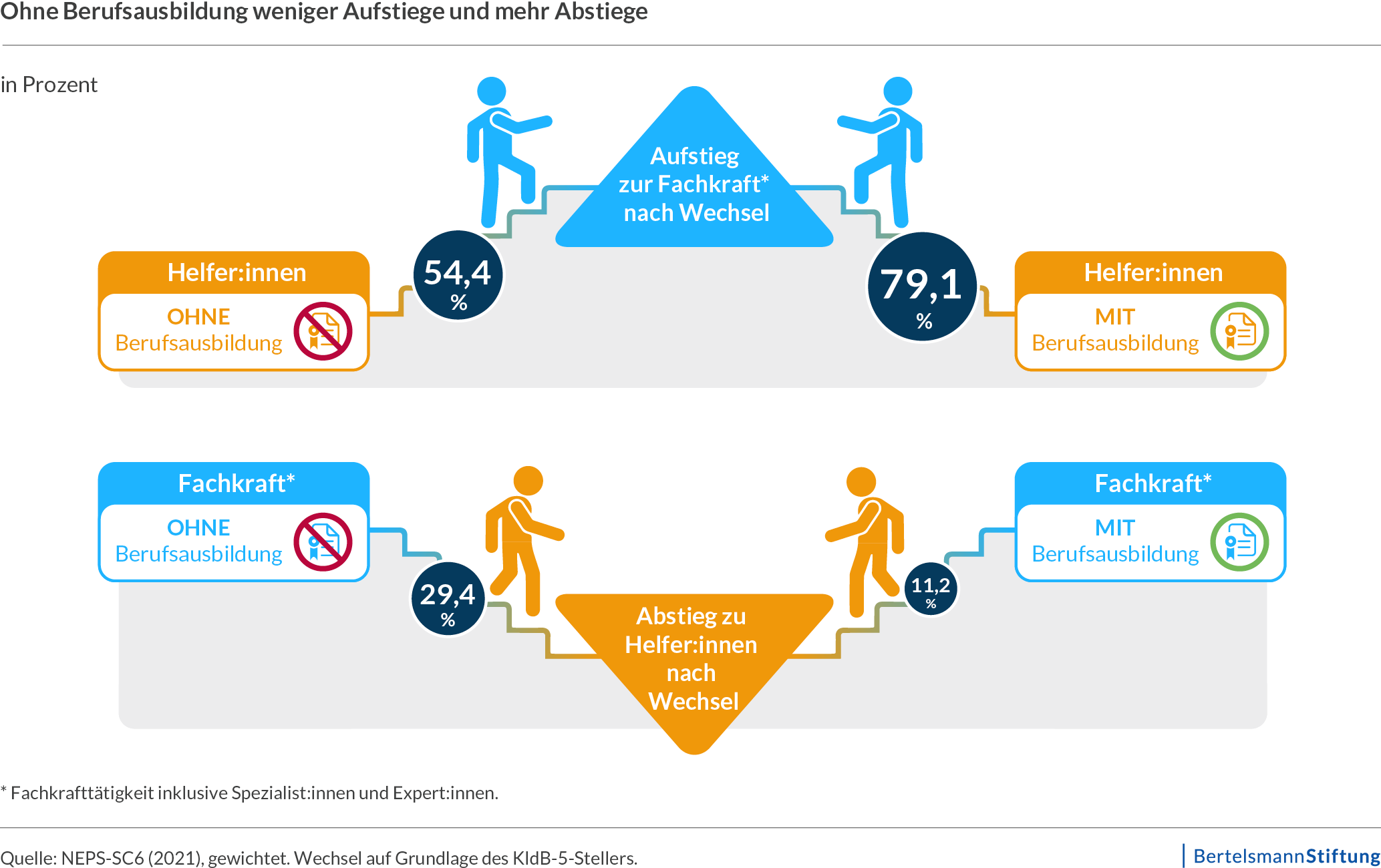 Die Studie zeigt, dass Personen mit einer Berufsausbildung im Vergleich zu jenen ohne Ausbildung eine um 50 Prozent erhöhte Aufstiegsquote von Helfer:innen zu Fachkräften haben. Demgegenüber droht Personen ohne Berufsabschluss bei einem Jobwechsel der Abstieg. Ihr Risiko, bei einem Jobwechsel von einer Fachkrafttätigkeit in einem Helferberuf abzusteigen, ist dreimal so hoch wie für Erwerbstätige mit Berufsausbildung.