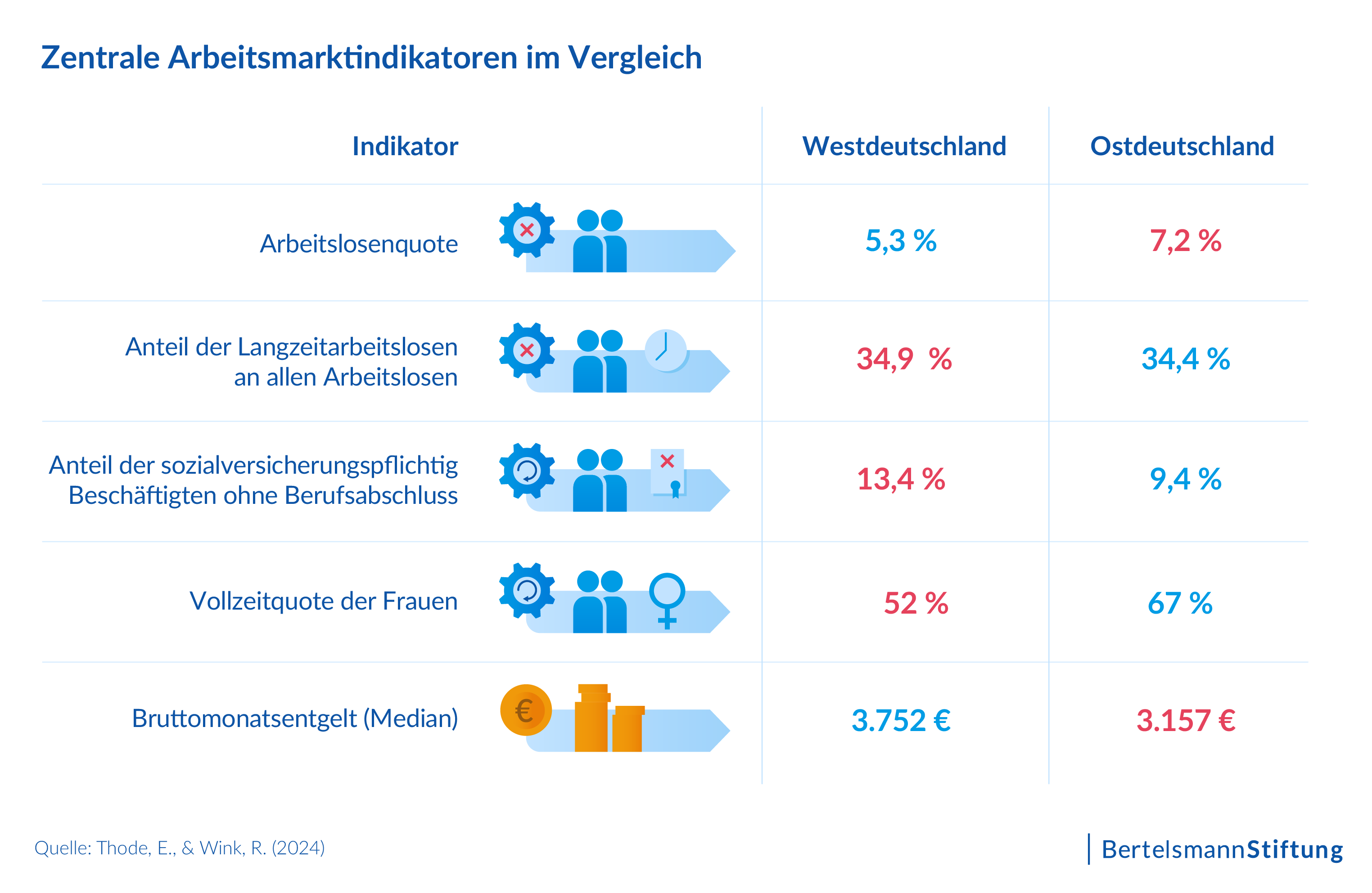 Der ostdeutsche Arbeitsmarkt hat einen Wandel sondergleichen hinter sich. Der Wechsel von der Plan- zur Marktwirtschaft kostete in den ehemals volkseigenen Betrieben 70 Prozent der Arbeitsplätze. Bis 2005 stieg die Arbeitslosenquote auf knapp 19 Prozent. Für viele Menschen hieß das als Konsequenz, ihr Glück im Westen zu versuchen. Zwischen 1991 und 2022 kehrten 1,2 Millionen Menschen ihrer Heimat den Rücken.