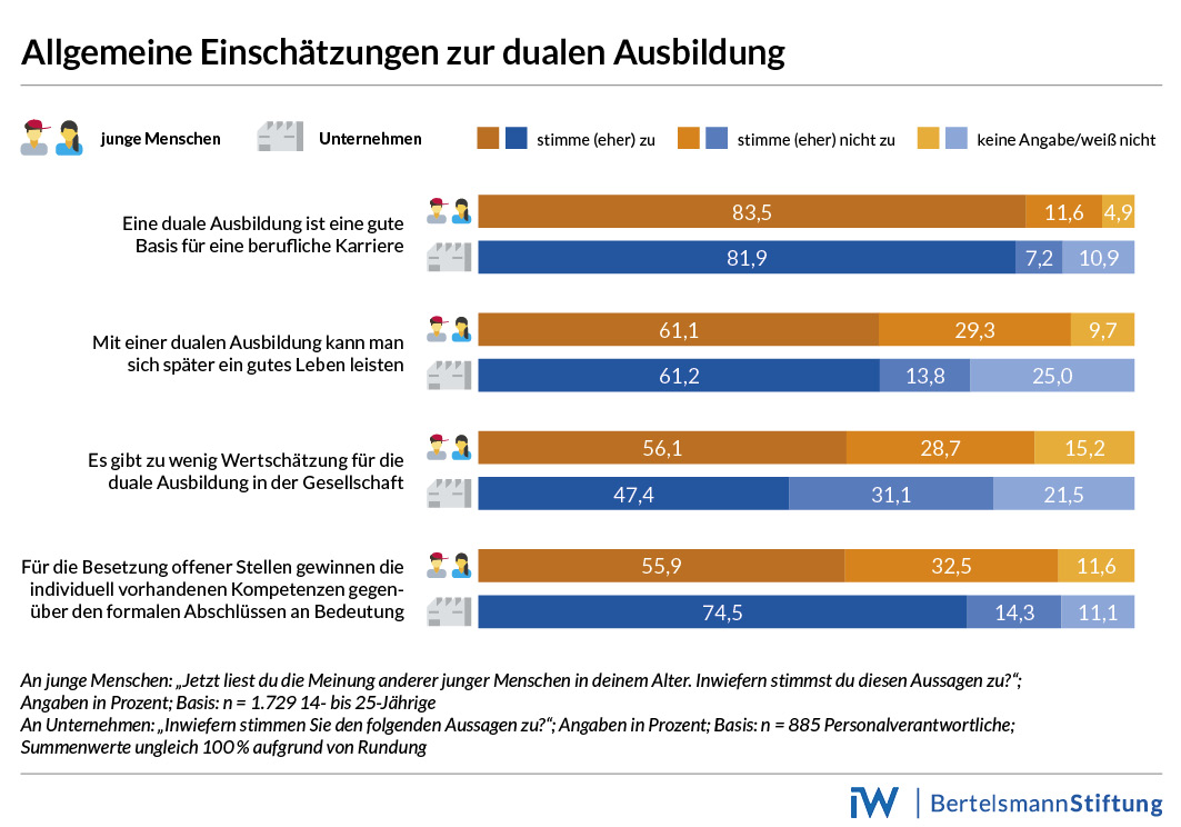 Die Ausbildungslücke in Deutschland bleibt groß. Zuletzt blieben über 73.000 Ausbildungsplätze unbesetzt, während gleichzeitig mehr als 63.000 junge Menschen keine Lehrstelle fanden. Rund 44 Prozent der Unternehmen konnten ihre Ausbildungsplätze im Ausbildungsjahr 2023/24 nur anteilig oder überhaupt nicht besetzen. Trotzdem meint jede:r vierte junge Mensch in Deutschland, es gebe zu wenig Ausbildungsplätze. Diese Diskrepanz entsteht dadurch, dass die Ausbildungsangebote von Betrieben und die Berufswünsche von jungen Menschen hinsichtlich Region, Beruf oder Qualifikation häufig nicht zusammenpassen. Wie eine gemeinsame Jugend- und Unternehmensbefragung der Bertelsmann Stiftung und des Instituts der deutschen Wirtschaft (IW) jetzt zeigt, liegt es aber auch an der Kommunikation, dass Bewerber:innen und Unternehmen nicht zueinanderfinden.