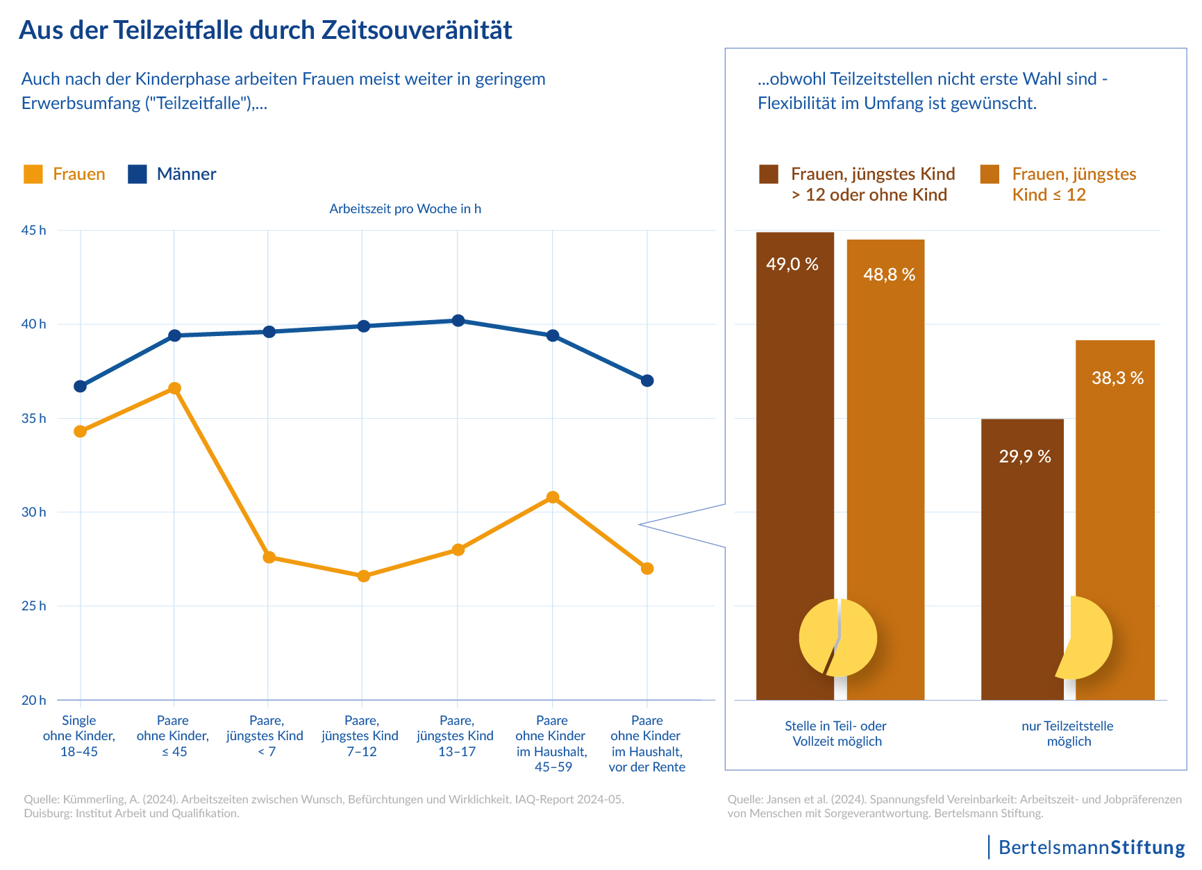Doch auch klassische Teilzeitstellen sind für viele Frauen keine Alternative. Frauen mit jüngeren Kindern befürworten lediglich zu 38,3 Prozent Teilzeit. Bei kinderlosen Frauen und bei Müttern mit älteren Kindern sind es sogar nur 29,9 Prozent. "Reine Teilzeit ist ganz offensichtlich keine Präferenz, auch nicht bei Müttern", erklärt unsere Arbeitsmarktexpertin, Luisa Kunze. "Mütter können aufgrund stereotyper Aufgabenverteilung in der Partnerschaft nach dem Wiedereinstieg ins Berufsleben oft nur Teilzeit arbeiten. Wenn sie ihre Arbeitszeit nicht flexibler aufstocken können, stecken sie in der Teilzeitfalle fest. Viele bleiben bei einem geringen Stundenumfang, berufliche Karrieren brechen ab und Potenziale gehen verloren."