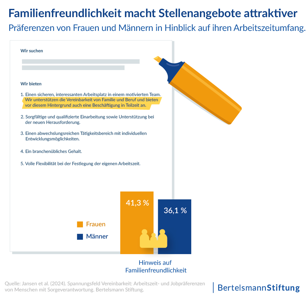 Reine Teilzeitstellen mit starren Arbeitszeiten sind weder bei Frauen noch bei Männern beliebt. Gefragt sind dagegen Stellen, die hohe Flexibilität bieten, sowohl was den Umfang als auch die Lage der täglichen Arbeitszeit angeht. Familienfreundlichkeit ist ein weiterer Aspekt, der insbesondere für Frauen einen hohen Stellenwert hat.