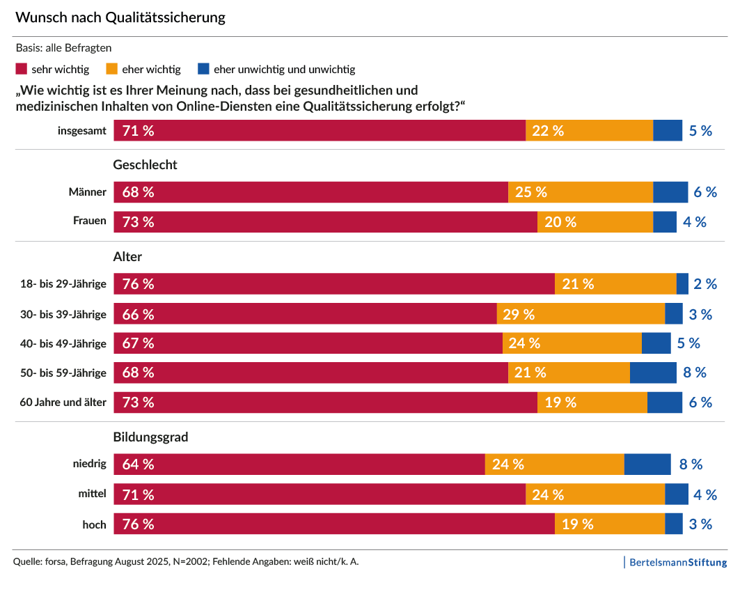 Der Wunsch der Menschen in Deutschland nach qualitativ guten und verlässlichen Gesundheitsinformationen im Internet ist groß. 93 Prozent halten eine Qualitätssicherung bei gesundheitlichen und medizinischen Inhalten im Netz für wichtig, wie aus einer repräsentativen Befragung im Auftrag unserer Stiftung hervorgeht. Ein wichtiger Grund dafür dürfte sein, dass 71 Prozent der Bundesbürger:innen ihre digitale Gesundheitskompetenz als gering einschätzen, wie der aktuelle "Health Literacy Survey" (HLS-GER 3) der Universität Bielefeld zeigt. Vielen Menschen fällt es schwer zu beurteilen, ob Informationen zu Gesundheitsthemen im Internet vertrauenswürdig sind.