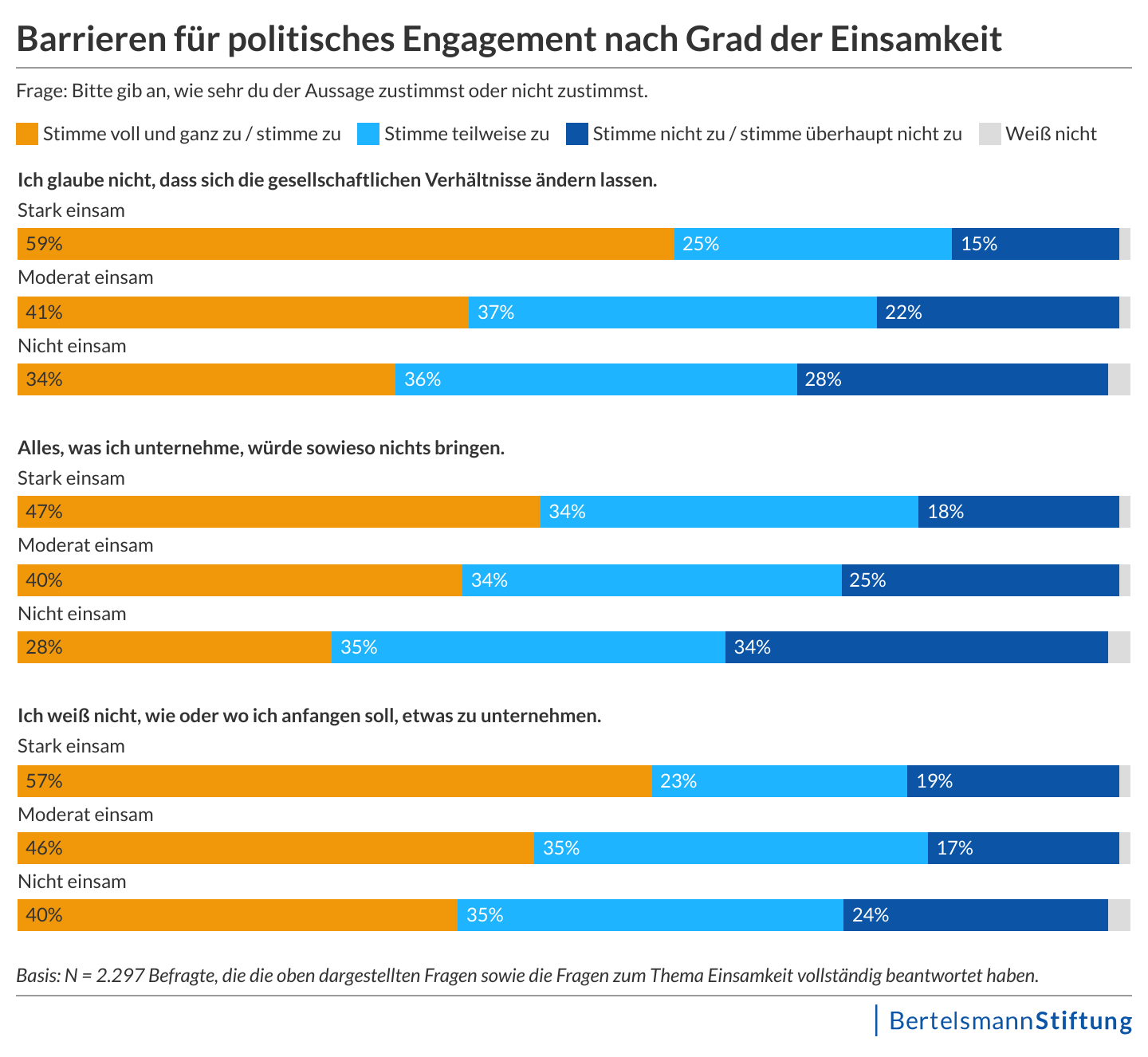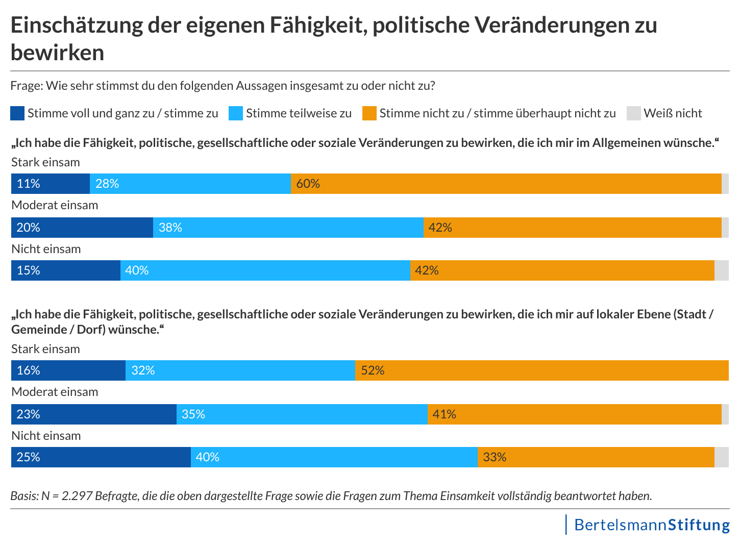 60 Prozent der jungen Menschen in Deutschland, die sich stark einsam fühlen, glauben nicht, dass sie politische oder gesellschaftliche Veränderungen bewirken können. Von denjenigen, die sich nicht einsam fühlen, zweifeln 42 Prozent daran, mit ihrem Handeln etwas bewegen zu können. Ein ähnliches Bild zeigt sich auf lokaler Ebene: Während sich ein Drittel der nicht einsamen Befragten die Fähigkeit abspricht, Dinge in ihrer Stadt oder ihrer Gemeinde verändern zu können, sind es bei den stark Einsamen mehr als die Hälfte (52 Prozent). Auch das Vertrauen in demokratische Strukturen ist bei den stark Einsamen deutlich geschwächt: 63 Prozent zeigen sich unzufrieden mit der Demokratie in Deutschland, bei den nicht Einsamen sind es 41 Prozent.