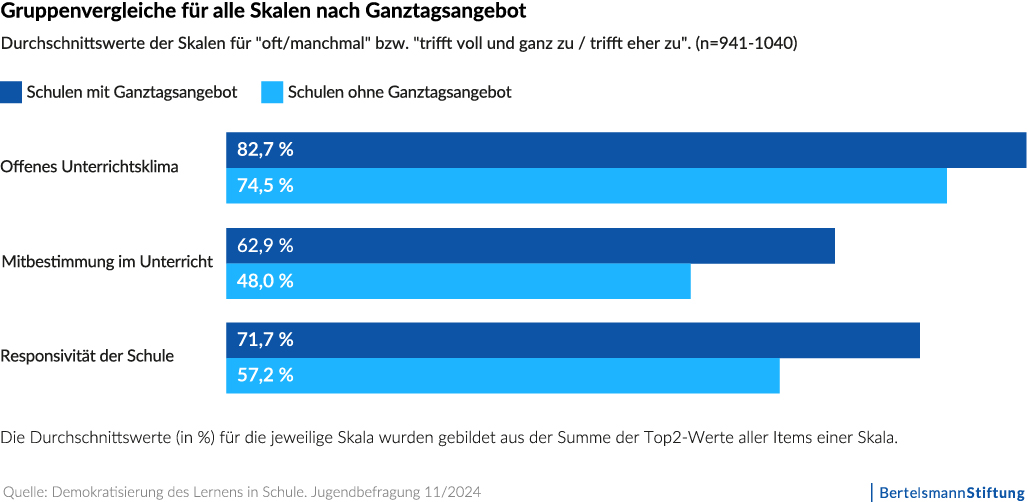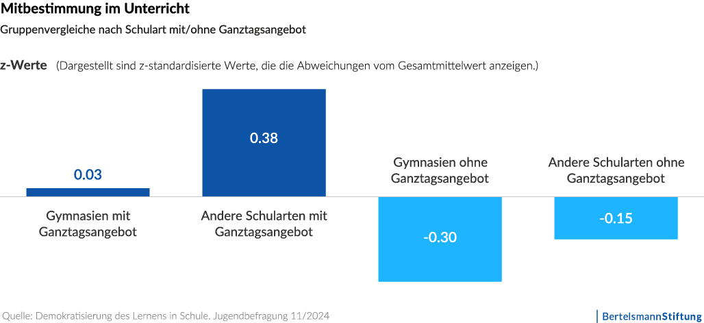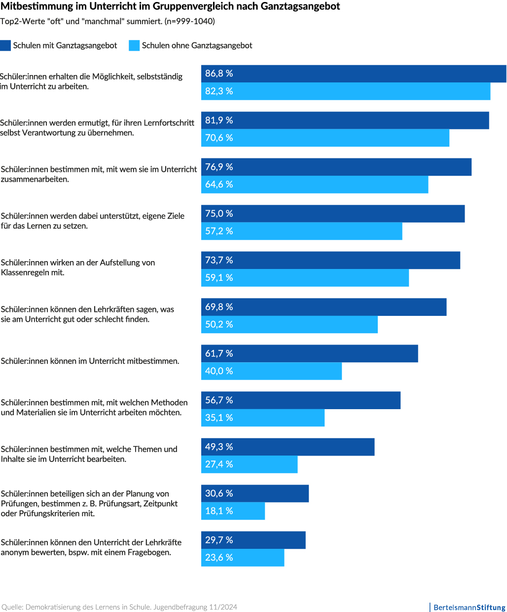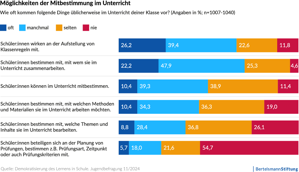 Zugleich geht aus der Studie "Demokratisierung des Lernens in Schule" hervor, dass sich das demokratische Potenzial der jungen Menschen besser fördern ließe: So geben 63 Prozent der befragten Schüler:innen an, selten oder nie darüber mitbestimmen zu können, welche Themen und Inhalte sie im Unterricht bearbeiten. 55 Prozent berichten, dass sie kaum Einfluss auf die verwendeten Methoden und Materialien nehmen können. Auch bei der Feedback-Kultur gibt es Luft nach oben: 41 Prozent können den Lehrkräften selten oder nie mitteilen, was sie am Unterricht gut oder schlecht finden. Nur die Hälfte glaubt, Entscheidungen beeinflussen zu können, die die ganze Schule betreffen. Insbesondere in Gymnasien ohne Ganztagsangebot erleben die Schüler:innen wenig Möglichkeiten der Mitbestimmung.
