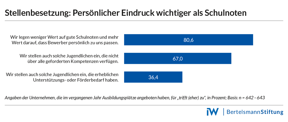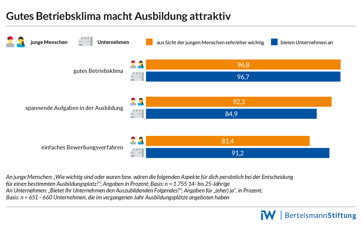 Für die überwiegende Mehrheit der jungen Menschen (92 Prozent) machen spannende Aufgaben eine Ausbildung attraktiv. Fast alle jungen Menschen (95 Prozent) wünschen sich daher vorab Informationen über die konkreten Inhalte und Tätigkeiten einer Ausbildung. Diese stellen jedoch nur drei Viertel der befragten Unternehmen vor einem Bewerbungsgespräch bereit. Sehr große Übereinstimmung gibt es dagegen hinsichtlich des Betriebsklimas: Mit 97 Prozent steht für die befragten jungen Menschen ein gutes Betriebsklima ganz oben auf der Wunschliste für eine attraktive Ausbildung, was ebenso viele Unternehmen nach eigener Einschätzung auch bieten können.