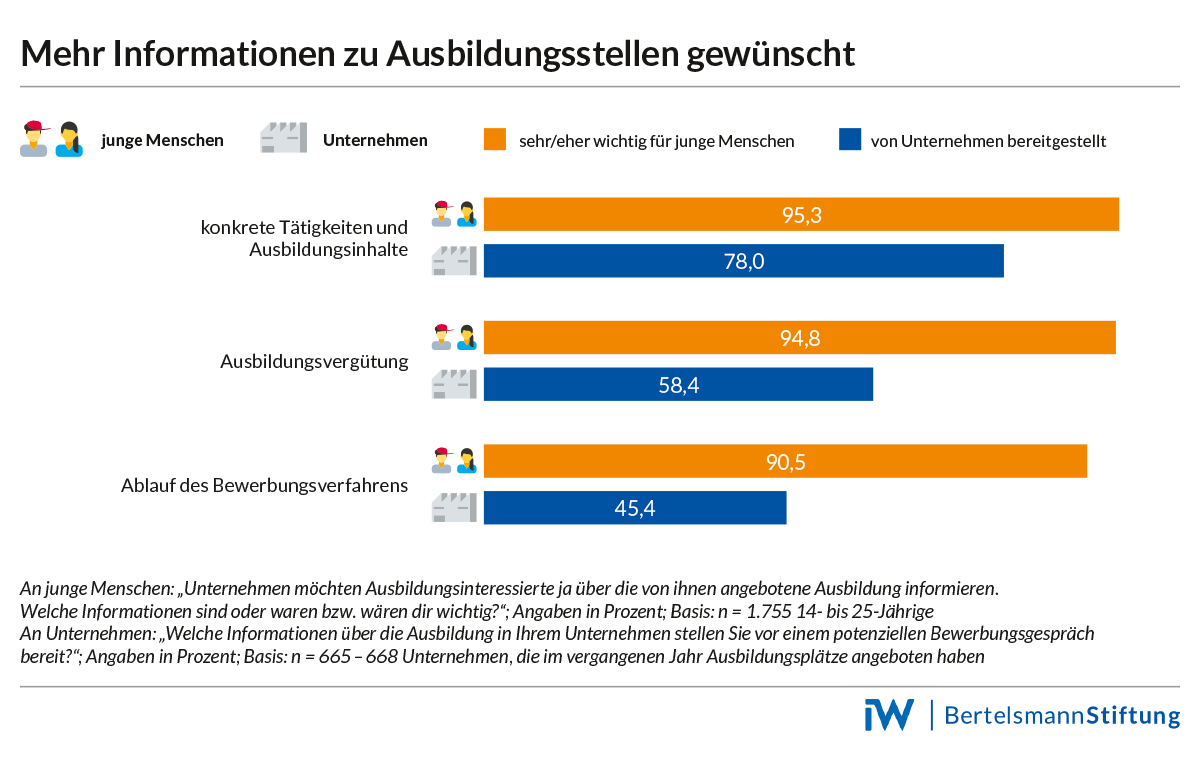 Vieles, was eine Ausbildung für junge Menschen attraktiv macht, bieten Unternehmen auch an. Allerdings erfüllen sie den Informationsbedarf von potenziellen Bewerber:innen oft nur zum Teil. Das geht aus einer gemeinsamen Studie von uns und dem Institut der deutschen Wirtschaft (IW) hervor. Von den befragten jungen Menschen zwischen 14 und 25 Jahren geben knapp 95 Prozent an, dass ihnen Informationen über die Ausbildungsvergütung wichtig sind. Allerdings stellen nur knapp 60 Prozent der befragten Unternehmen diese Angaben vor einem Bewerbungsgespräch bereit.