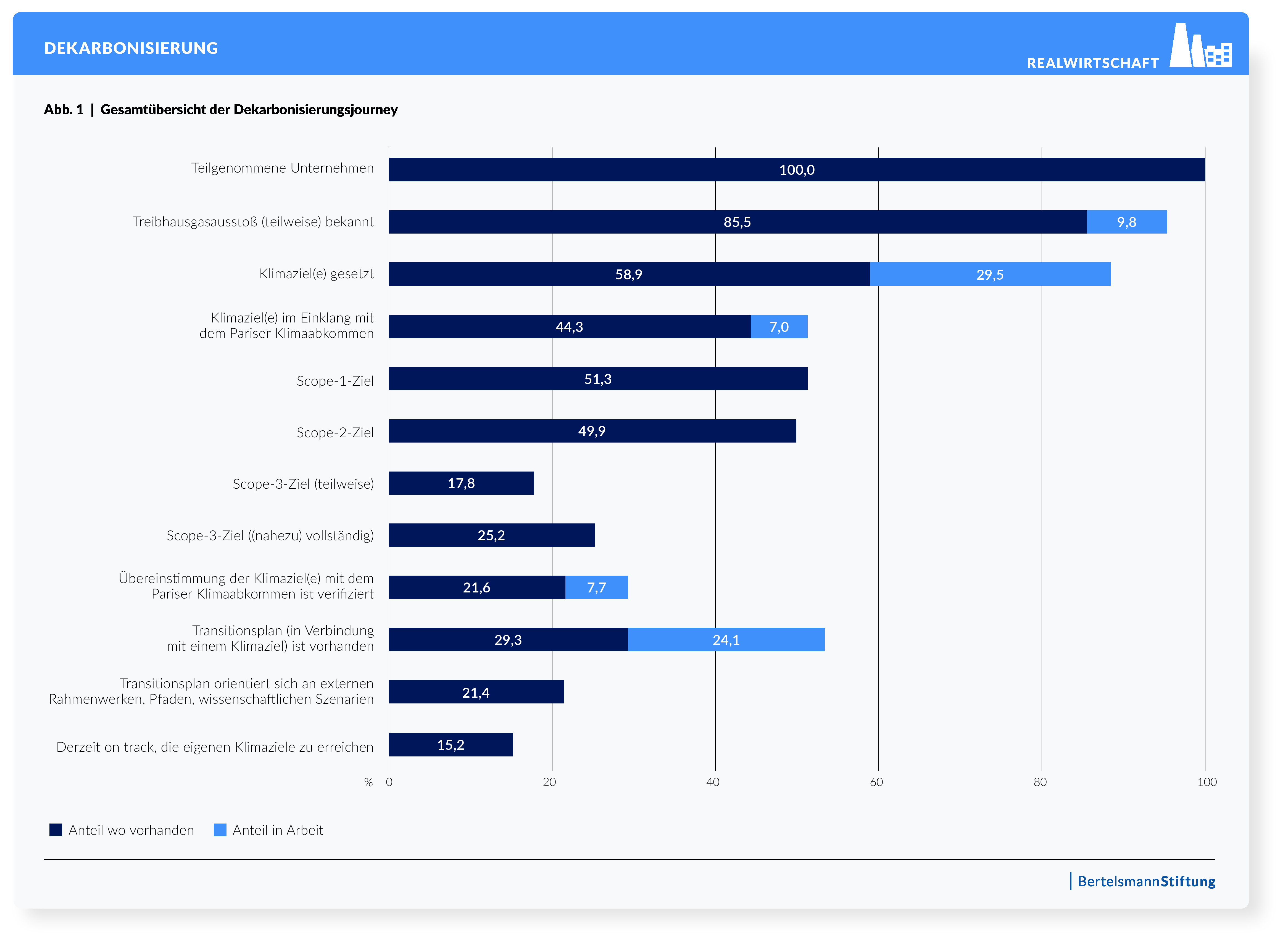 Von der Tagesordnung ist die Nachhaltigkeitstransformation dennoch nicht verschwunden. So ist der Anteil der Unternehmen und Banken, die ihre Treibhausgasemissionen erfassen, auf 86 Prozent gestiegen. Auch die Klimaziele werden in der Realwirtschaft überwiegend beibehalten oder sogar weiterentwickelt. Der Anteil der Firmen mit selbstgesteckten Klimazielen erhöht sich von 53 Prozent auf 59 Prozent. Bei den Banken steigt er von 46 Prozent auf 65 Prozent und damit sogar noch deutlicher an. "Es ist ein wichtiges Signal, dass immer mehr Unternehmen ihre Emissionen erfassen und an Klimazielen festhalten. Entscheidend ist nun, dass daraus konkrete Transformationspfade mit klaren Investitionsentscheidungen, Zeitachsen und Finanzierungsplänen entstehen", sagt Philipp Wesemann, Projektmanager im Bereich Klimaresiliente Gesellschaft der Stiftung Mercator. An den konkreten Plänen, wie die Zielvorgaben zu erreichen sind, mangelt es vielfach jedoch noch. 41 Prozent der Unternehmen mit Klimazielen geben an, dass ihr Transitionsplan noch "in Planung" ist. "Daten zur Transformation sind kein Selbstzweck. Sie müssen in die Unternehmenssteuerung sowie in Investitions- und Finanzierungsentscheidungen eingebunden werden", sagt Manuel Reppmann, Projektleiter der Studie und Nachhaltigkeitsexperte der Universität Hamburg.