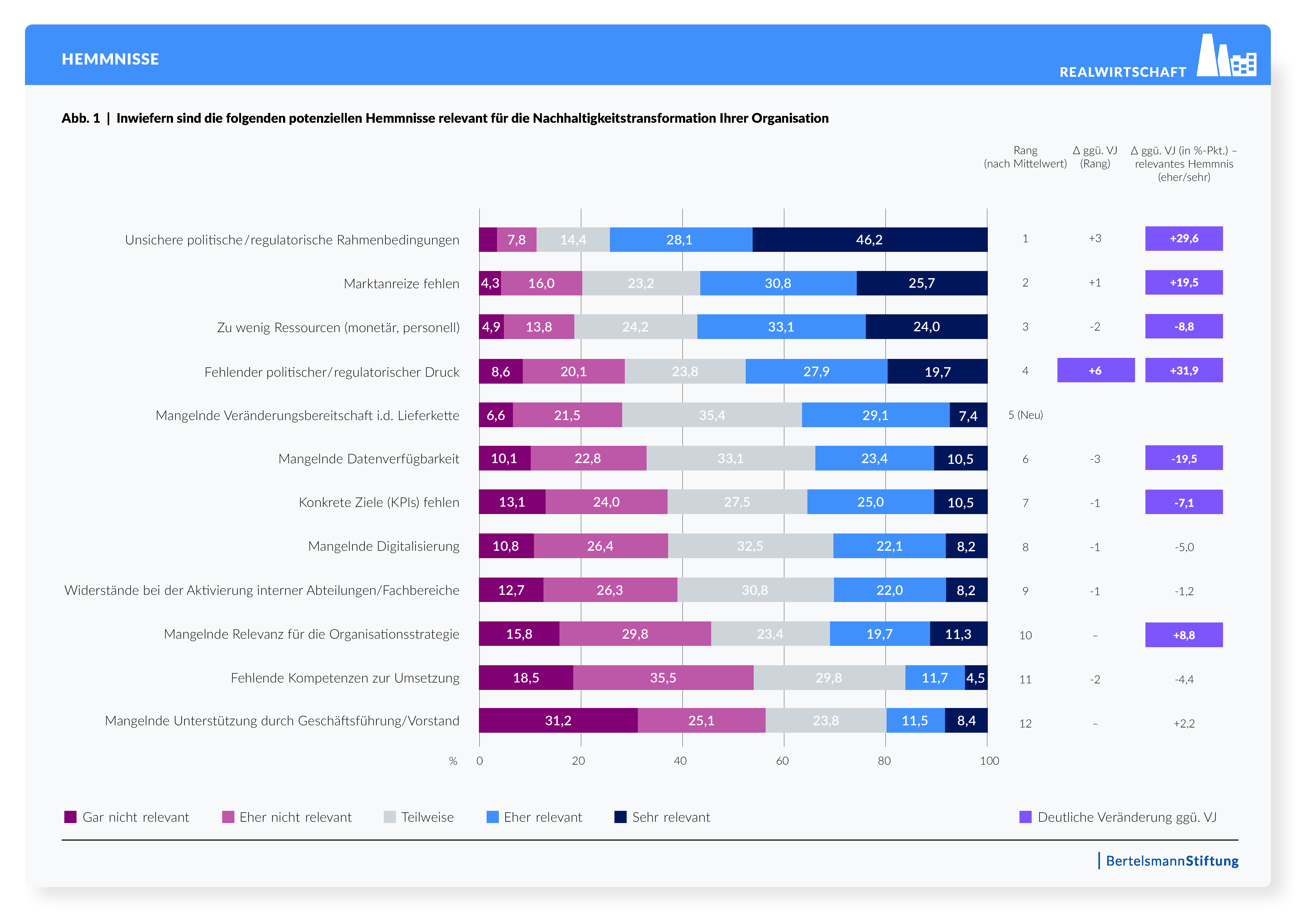 Die stärksten Treiber der Nachhaltigkeitstransformation sind "zukünftige Arbeitnehmer:innen" sowie "die Geschäftsführung", gefolgt von der "Jungen Generation" und "Wettbewerbern". Auffallend ist, dass nahezu alle potenziellen Treiber in ihrer Intensität teilweise stark sinken (Arbeitnehmer:innen: -12 Prozentpunkte, Geschäftsführung: -7 Prozentpunkte). Besonders stark verändert hat sich aus Unternehmenssicht die Relevanz der Politik für den Transformationsprozess. In den vergangenen Jahren hatten die Unternehmen sie noch als wichtigen Treiber wahrgenommen. Im STM 2026 sinkt deren Bedeutung als Treiber erheblich um 31 Prozentpunkte. Gleichzeitig werden unsichere politische und regulatorische Rahmenbedingungen jetzt stärker als Hemmnis für die Transformation empfunden (+30 Prozentpunkte).