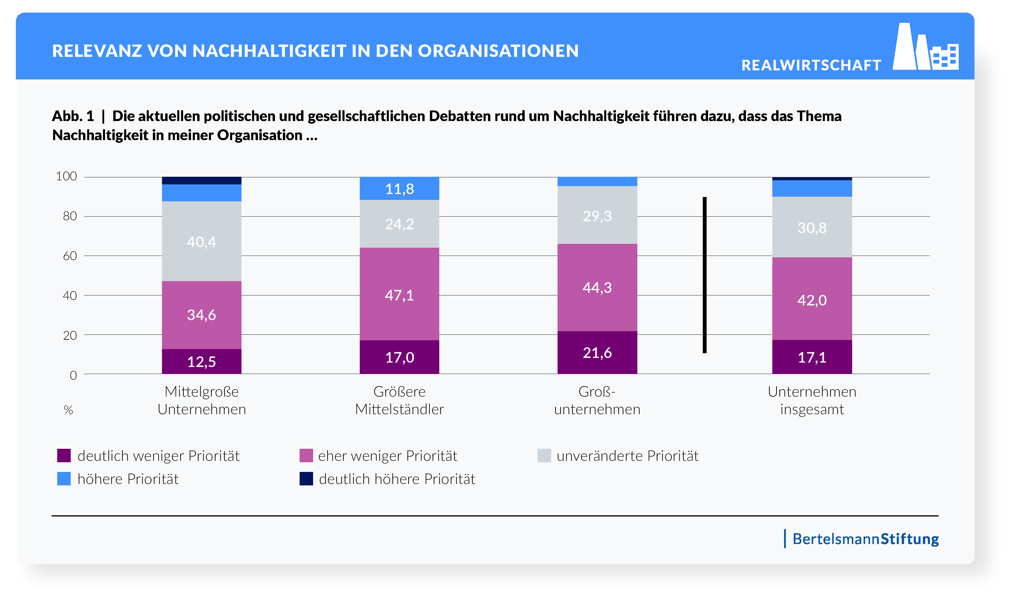 In der öffentlichen Debatte rückt das Thema Nachhaltigkeit derzeit in den Hintergrund. Das wirkt sich auch auf die Haltung der Unternehmen aus. Bei 59 Prozent der Unternehmen aus Real- und Finanzwirtschaft verliert Nachhaltigkeit intern an Priorität. Im Vorjahr gaben dies nur rund 14 Prozent der Unternehmen an. Vor allem Großunternehmen und größere Mittelständler spüren die Debatten stark. Die abnehmende Dynamik zeigt sich auch in der Stagnation der Verantwortung für das Thema auf Vorstands- und Geschäftsführungsebene, hier gab es keine Veränderung zum Vorjahr. Auch der Anteil der Unternehmen, die dies "in Planung" haben, geht um sieben Prozentpunkte zurück.