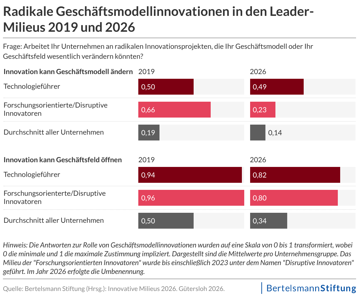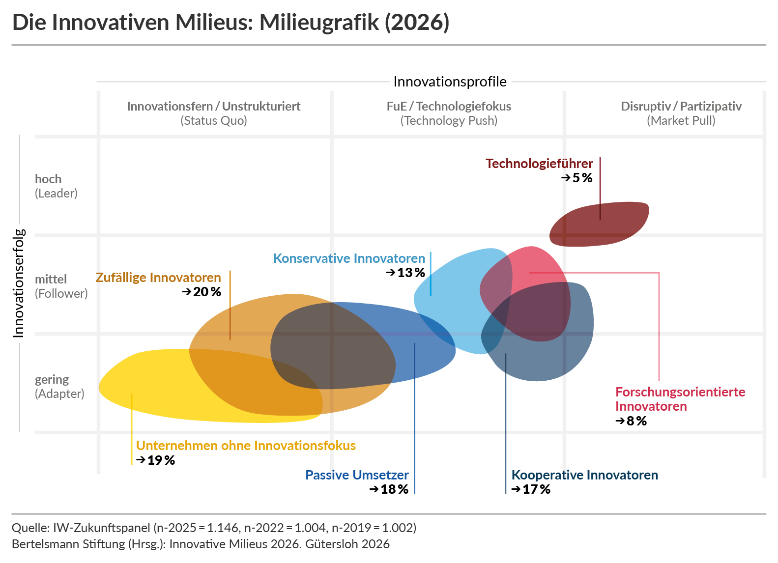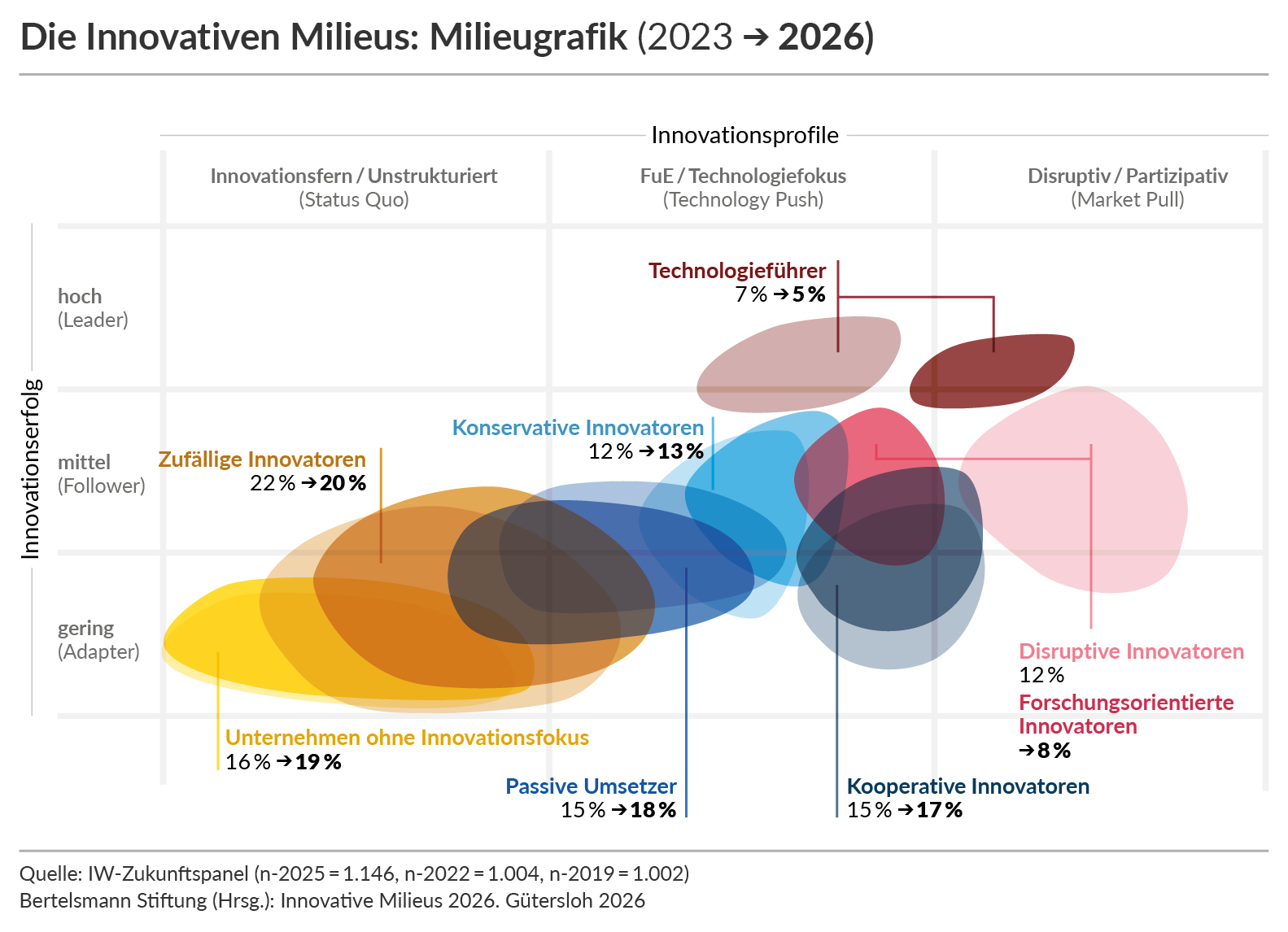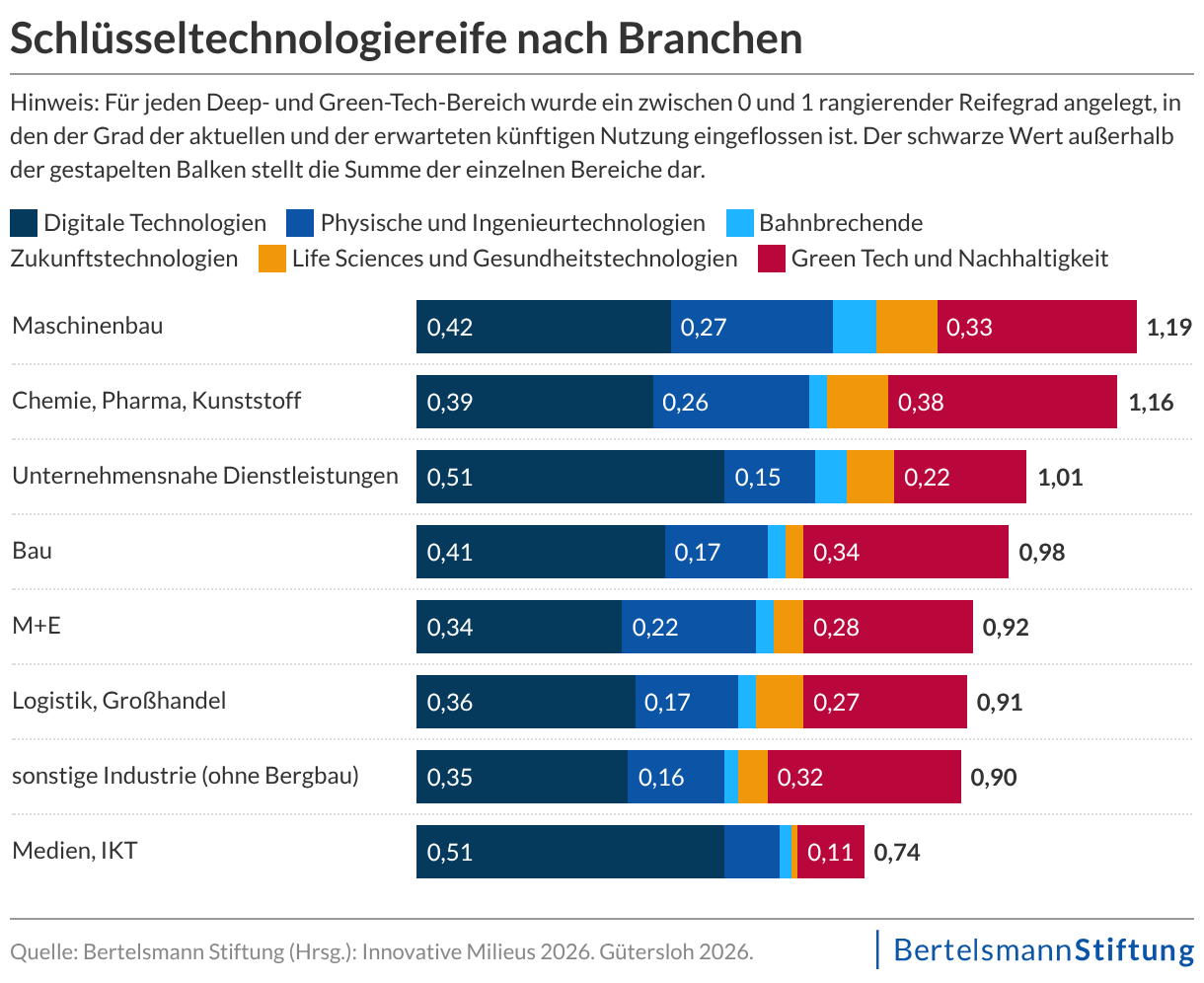 Gleichzeitig ist der Anteil innovationsschwacher Unternehmen auf nahezu 40 Prozent gestiegen. Innovation verliert damit in der Breite an strategischer Verankerung. Dies zeigt die Studie "Innovative Milieus 2026" in unserem Auftrag, für die mehr als 1.100 Unternehmen befragt wurden. "Die Innovationsbasis unseres Landes schrumpft, während der internationale Wettbewerb härter wird. Wenn wir jetzt nicht entschlossen handeln, riskieren wir einen nachhaltigen Verlust an technologischer Wettbewerbsfähigkeit", sagt unser Innovationsexperte Armando García Schmidt.