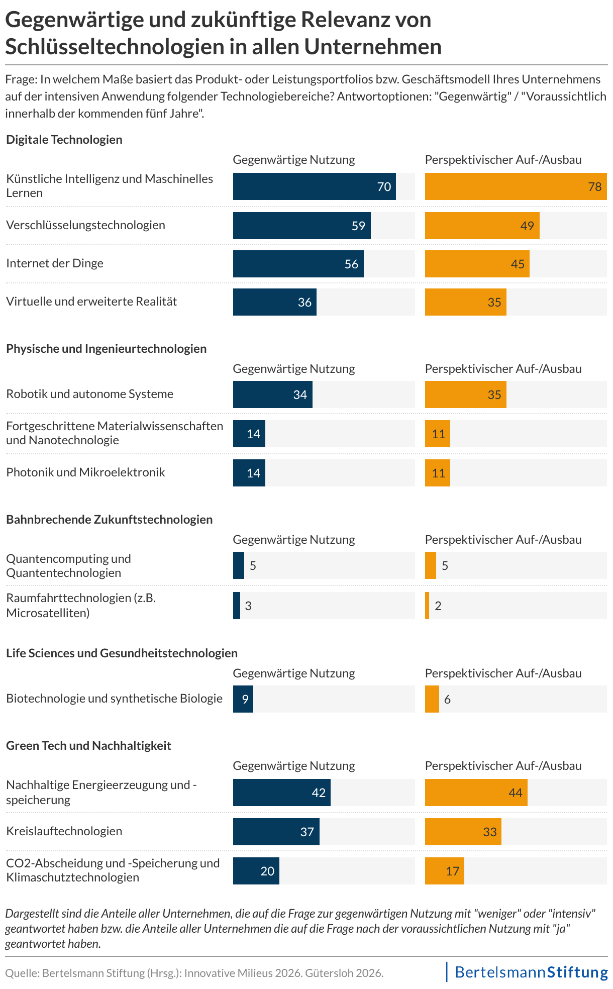 Anders ist die Lage bei komplexen Deep-Tech- und anspruchsvollen Green-Tech-Anwendungen. Technologien wie CO₂-Abscheidung oder andere forschungsintensive Zukunftstechnologien werden nur von wenigen Unternehmen intensiv genutzt. Auch im Bereich Kreislaufwirtschaft und nachhaltige Materialien sind Fortschritte sichtbar – doch eine breite Anwendung bleibt bislang aus. Anspruchsvolle Hochtechnologien nutzen nur wenige Unternehmen.