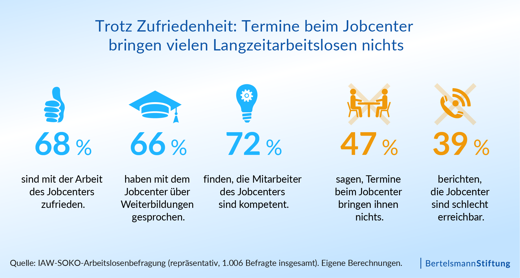 Trotz dieser insgesamt positiven Einschätzung zweifeln viele Langzeitarbeitslose an der Wirkung der Gespräche. 47 Prozent stimmen der Aussage zu, dass ihnen Termine im Jobcenter “nichts bringen”, also ihre Erfolgschancen auf dem Arbeitsmarkt nicht verbessern. “Beratung und Vermittlung sind Kernaufgabe der Jobcenter. Vermittlungshemmnisse müssen abgebaut werden. Doch gerade bei Personen mit erschwertem Zugang zum Arbeitsmarkt kommen diese Aufgaben häufig zu kurz”, sagt unser Arbeitsmarktexperte Tobias Ortmann. “Jobcenter nutzen ihre begrenzten Kapazitäten vor allem zur regelmäßigen Betreuung von Leistungsbeziehenden, die größere Chancen auf die Rückkehr auf den Arbeitsmarkt haben. Deswegen fehlt die Zeit, Arbeitslose mit Vermittlungshemmnissen zu betreuen.”