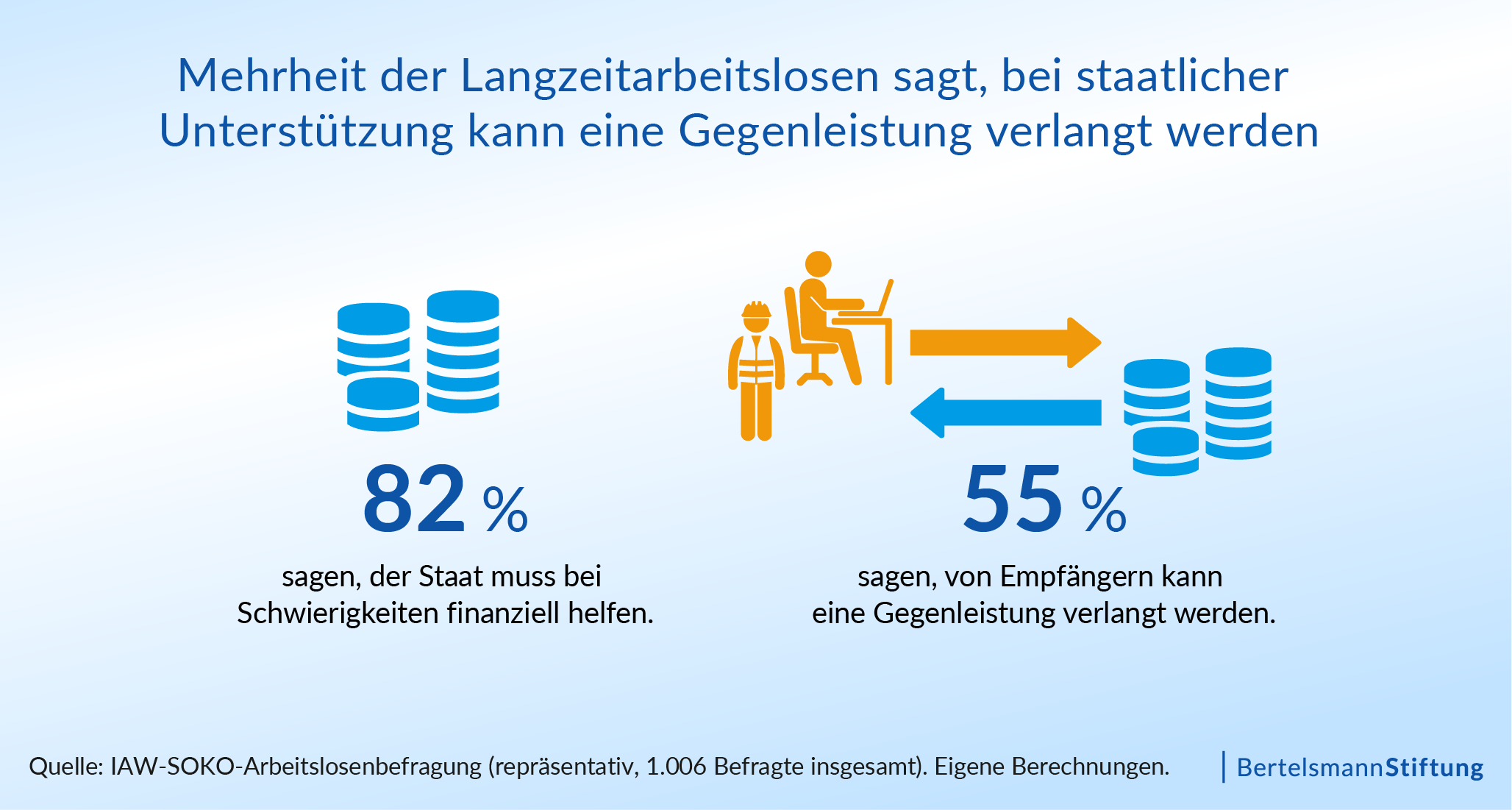 In den Beratungsgesprächen gilt es außerdem, Erwartungen frühzeitig zu klären – auf beiden Seiten. 82 Prozent der befragten Langzeitarbeitslosen sagen, der Staat müsse Menschen in schwierigen Lebenslagen finanziell unterstützen. Gleichzeitig ist eine Mehrheit der Ansicht, dass mit dieser Unterstützung auch Pflichten verbunden sein können: 55 Prozent stimmen der Aussage zu, dass von Bürgergeld-Empfänger:innen eine Gegenleistung erwartet werden kann. Diese Einstellungen sollten auch den Vermittlungsprozess prägen. Deshalb müssen die Kooperationsvereinbarungen zwischen den Arbeitslosen und den Jobcentern über die gesamte Betreuungsdauer hinweg gepflegt werden. Ziele, Pflichten und Unterstützung müssen verständlich vereinbart und bei Bedarf nachjustiert werden, damit sich weder falsche Vorstellungen noch überzogene Erwartungen verfestigen.