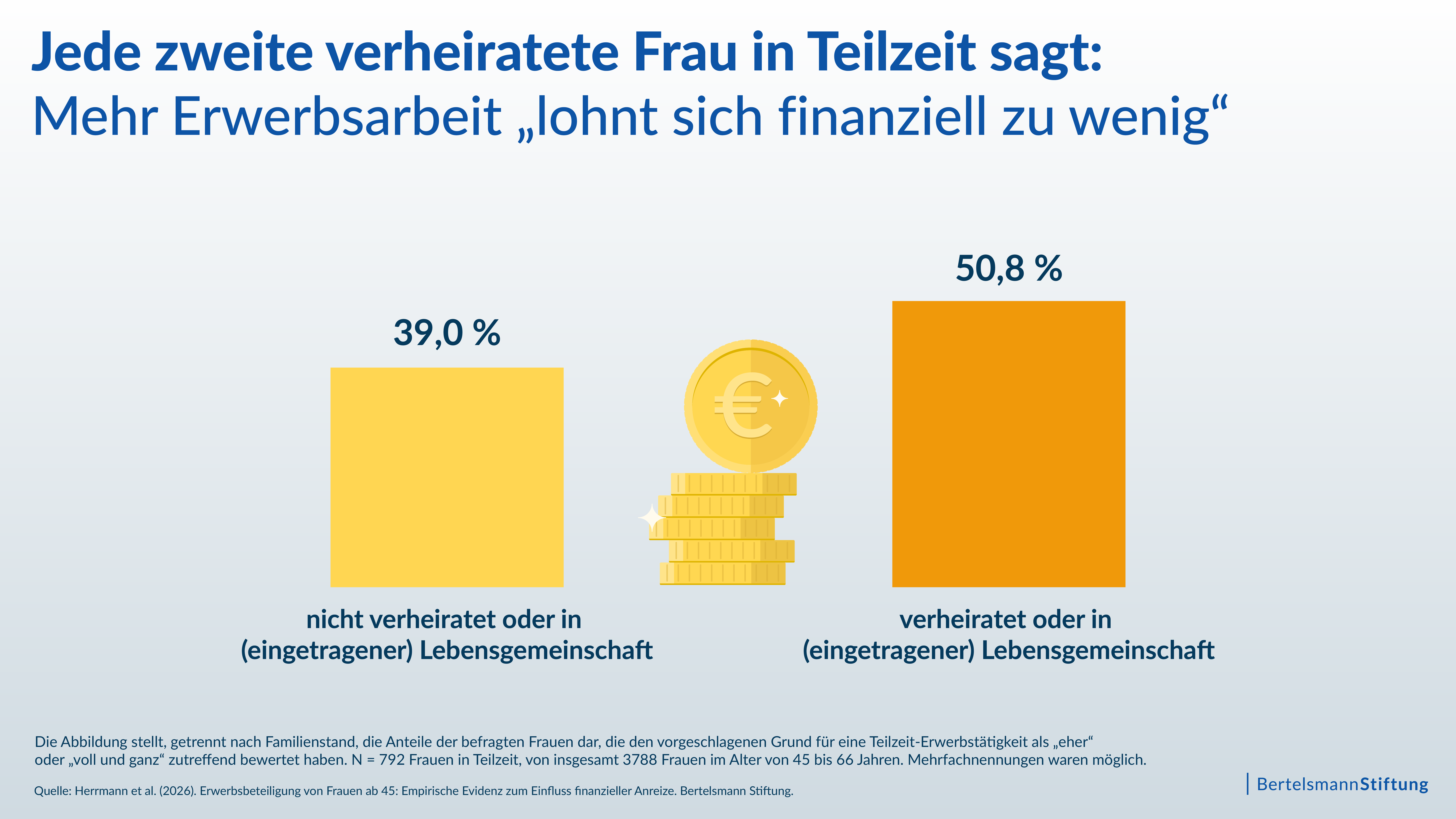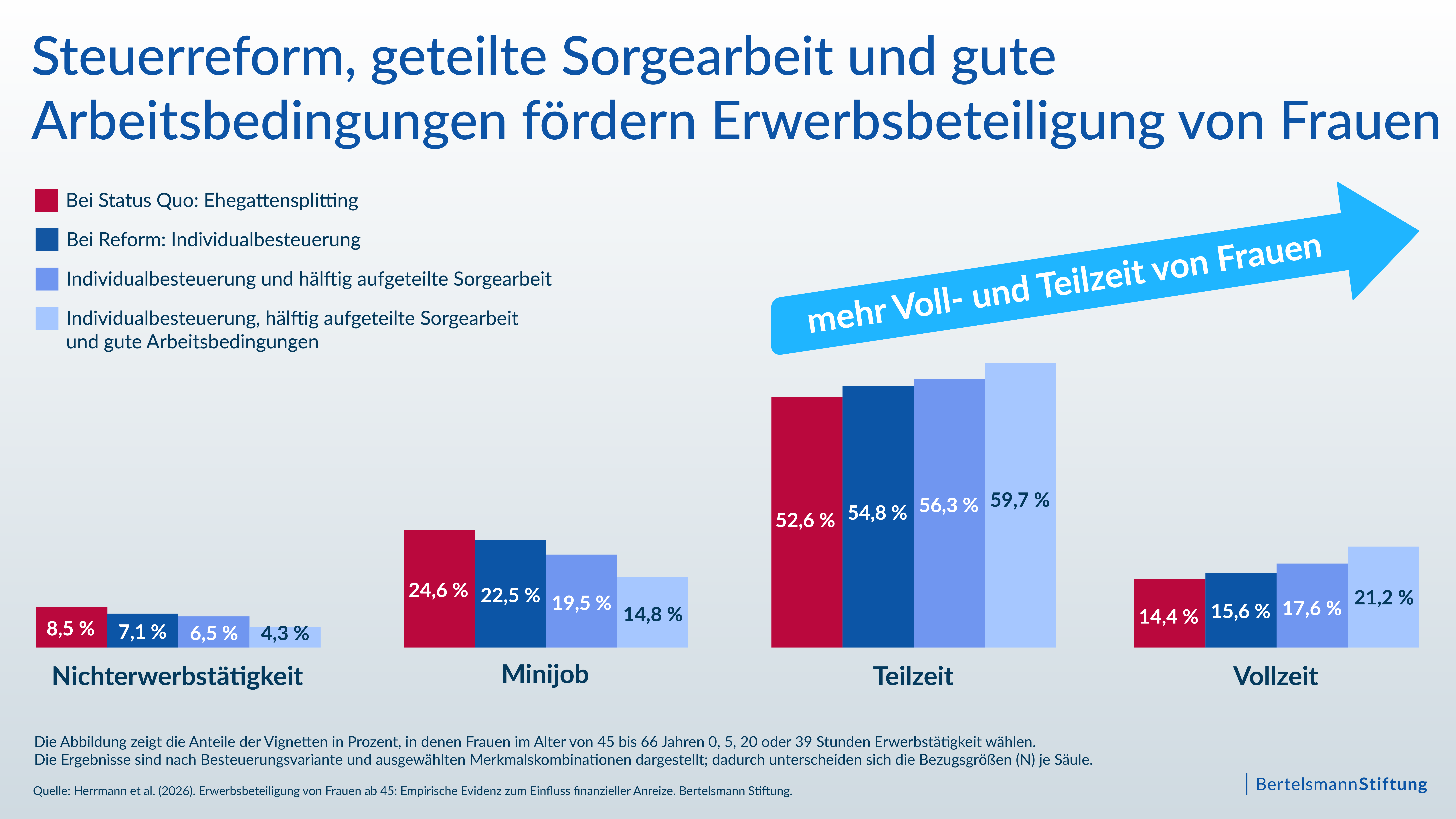 Knapp die Hälfte der teilzeitbeschäftigten Frauen in Deutschland im Alter von 45 bis 66 Jahren gibt an, dass sich eine Ausweitung der Arbeitszeit für sie finanziell nicht lohnt. Sie werden durch das für sie steuerlich ungünstige Ehegattensplitting ausgebremst: Bliebe vom Zusatzverdienst mehr Netto übrig, würden mehr Frauen erwerbstätig werden oder ihre Arbeitszeit ausweiten. Damit könnten 175.000 zusätzliche Vollzeitstellen besetzt werden. Zudem ginge der Anteil schlecht abgesicherter Minijobs zugunsten sozialversicherungspflichtiger Voll- oder Teilzeitbeschäftigung zurück.