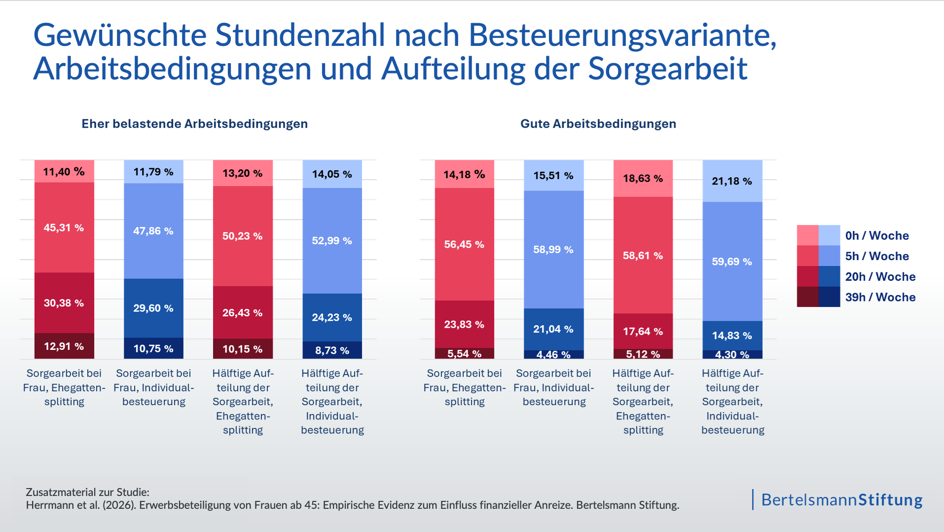 Darüber hinaus zeigten sich zwei Verstärker-Effekte, die eine Beschäftigung mit höherer Stundenzahl noch attraktiver machten: die gleichmäßige Aufteilung der Sorgearbeit und bessere Arbeitsbedingungen. Wird die Sorgearbeit zwischen den Partner:innen gleichmäßig aufgeteilt, steigen die durchschnittlichen Wochenarbeitsstunden signifikant an – bereits im aktuellen Steuersystem, und noch ausgeprägter unter einer Individualbesteuerung, also einer getrennten Veranlagung zur Einkommensteuer. Zudem zeigt die Erhebung, dass die Kombination aus Individualbesteuerung und geteilter Sorgearbeit zu höheren Zustimmungswerten (knapp 18 Prozent) für eine Vollzeiterwerbstätigkeit von 39 Stunden führt. Einen ähnlichen Effekt haben Arbeitsbedingungen, die mit geringer Belastung einhergehen. Sind diese gegeben, liegt auch hier der Anteil der Befragten, der sich einen Erwerbsumfang von 39 Wochenstunden wünscht, bei etwa 18 Prozent. Bei belastenden Arbeitsbedingungen und einseitiger Sorgearbeitsaufteilung sinkt der Anteil dagegen auf knapp 13 Prozent in beiden Szenarien.