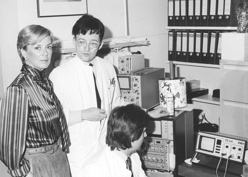 Liz Mohn bei Vorführung der intracraniellen Doppler-Sonografie an der Neurologischen Universitätsklinik Düsseldorf, 1984. V.l.: Liz Mohn, Michael Hennerici und Hans-Peter Hartung.
